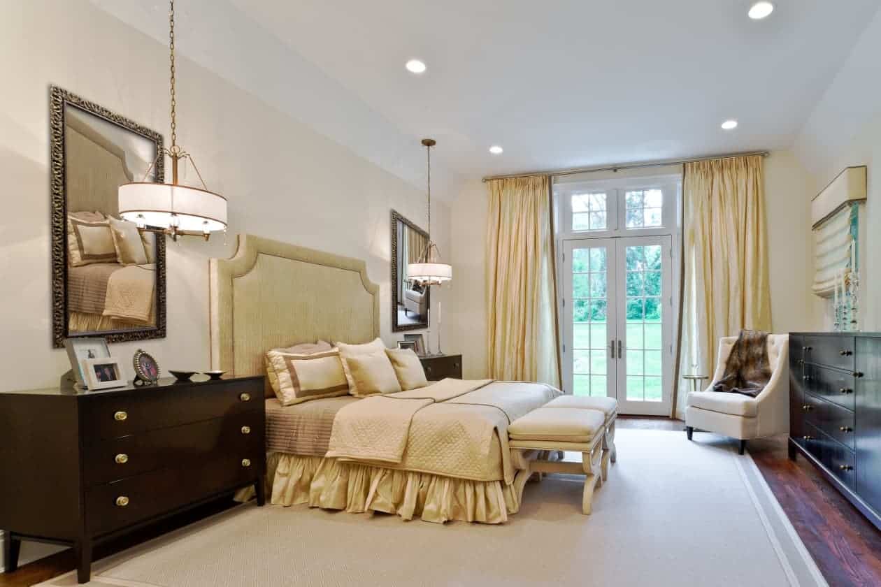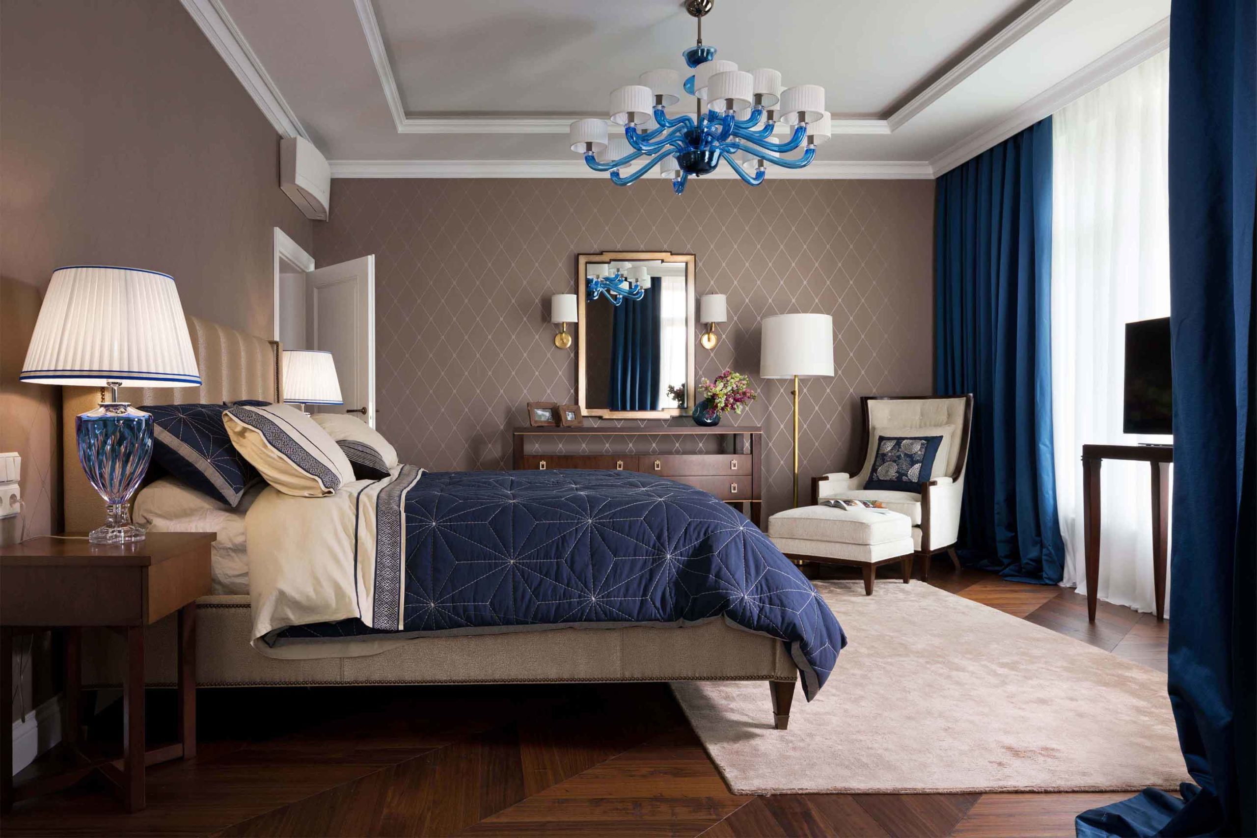 كلاسيك يمكن الاستفادة من استخدام التناقضات ، ولكن ضع في اعتبارك أيضًا قواعد الاعتدال. إذا "أعدت" بألوان متباينة ، يمكنك إفساد كل العمل. هنا ، على سبيل المثال ، غرفة نوم تم تصميمها بمزيج مثالي من لوحات البيج والأزرق الداكن.