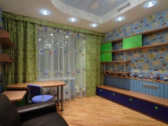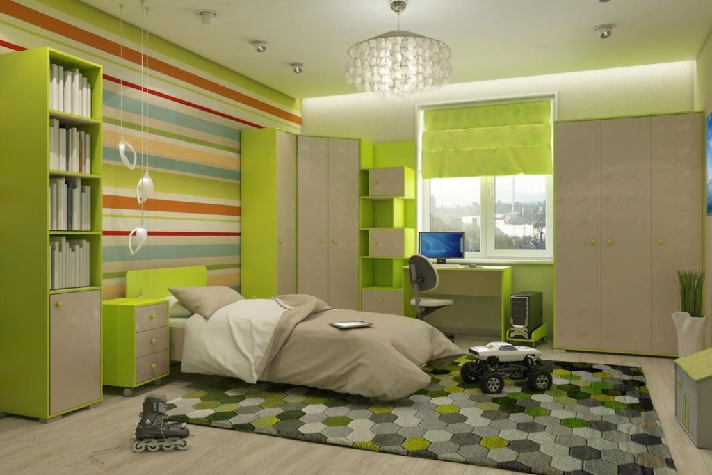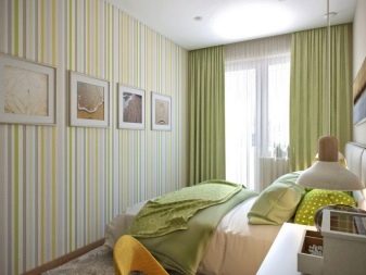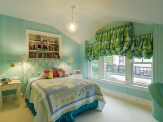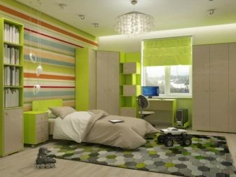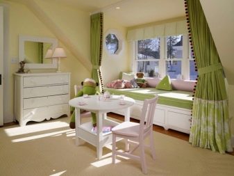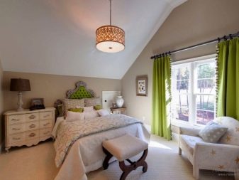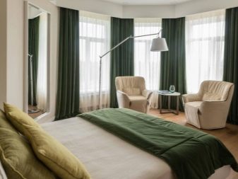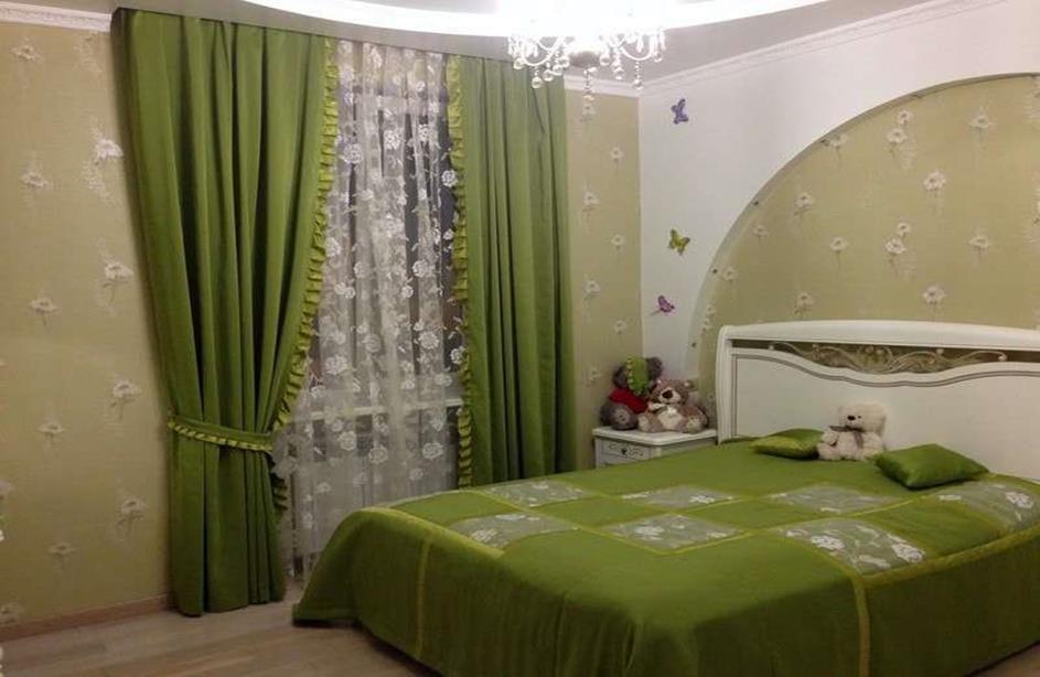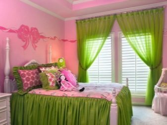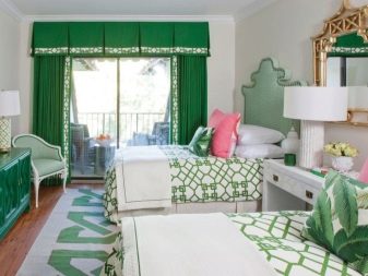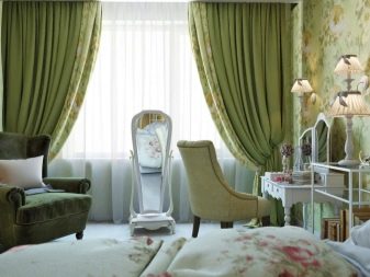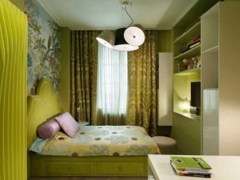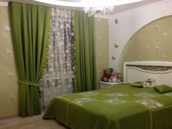 يعتمد اختيار تصميم الستائر على عمر مالك الغرفة. وبالتالي، لغرفة نوم الأطفال ، يتم اختيار نماذج ذات أنماط زاهية أو حيوانات مضحكة أو صور لأبطال الرسوم المتحركة المفضلة لديك. في غرف البالغين ، من الأفضل إعطاء الأفضلية للوحات أحادية اللون ذات اللون الأخضر المقيد. يُسمح هنا بطباعة بالكاد ملحوظة - نمط تجريدي أو زخرفة هندسية أو نباتية مصنوعة بلون أخضر داكن.