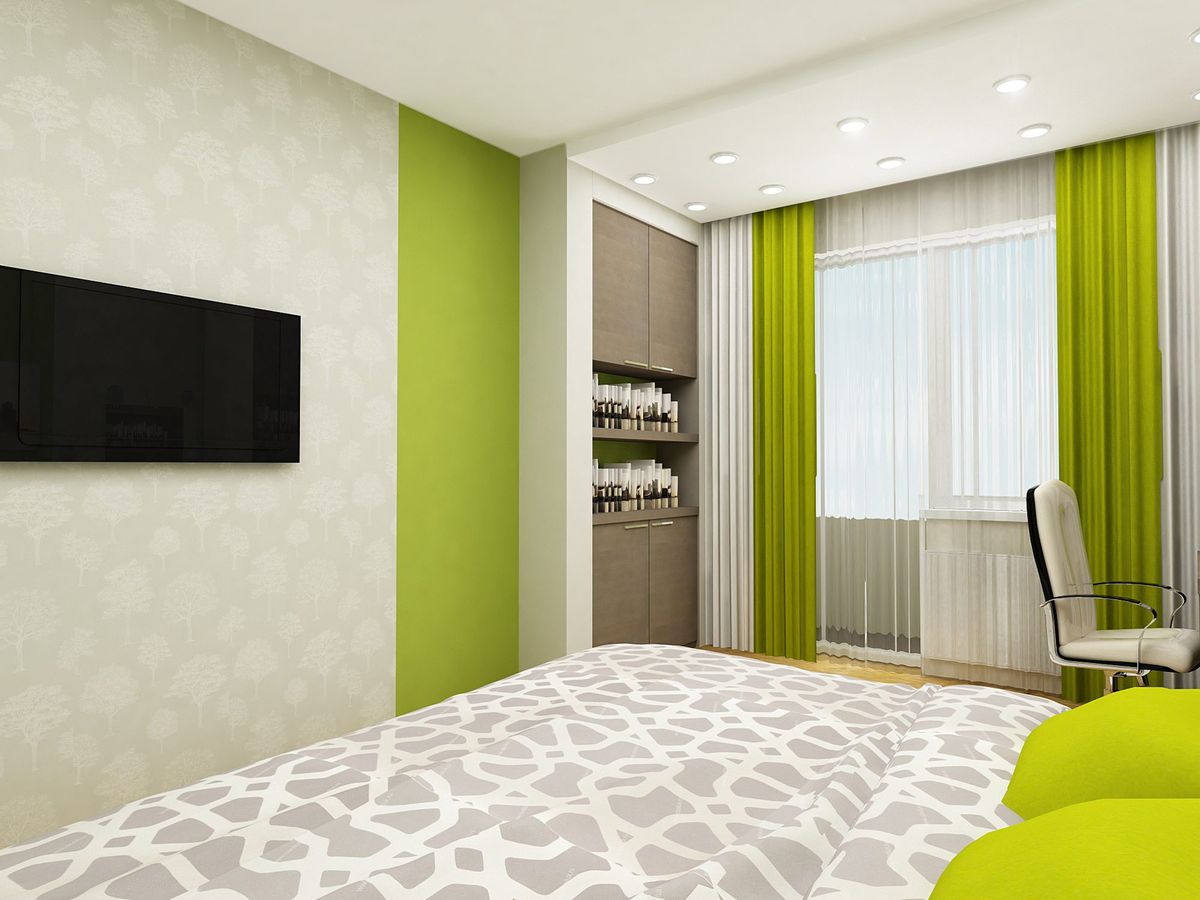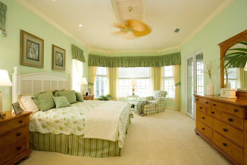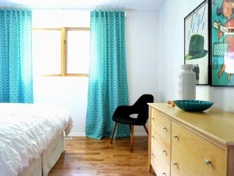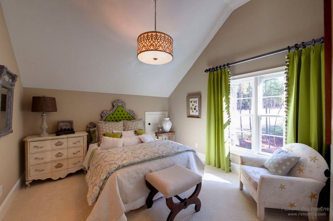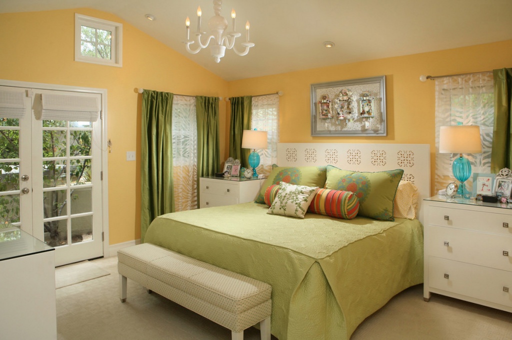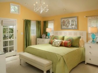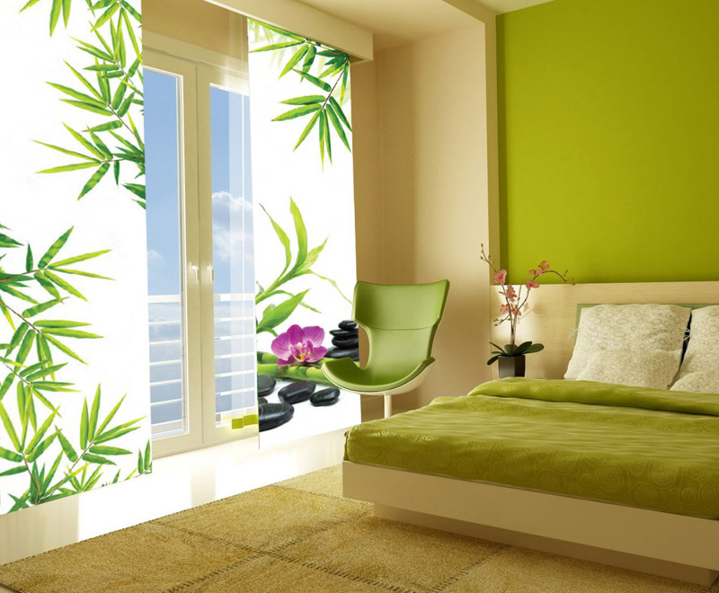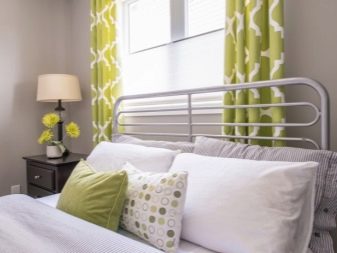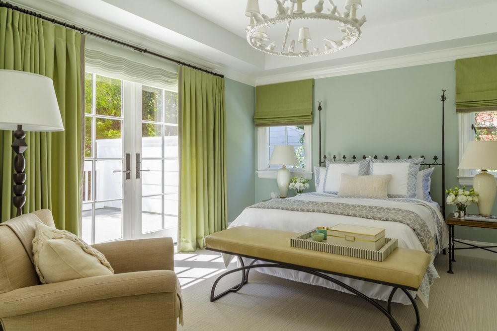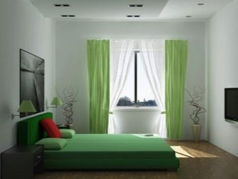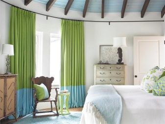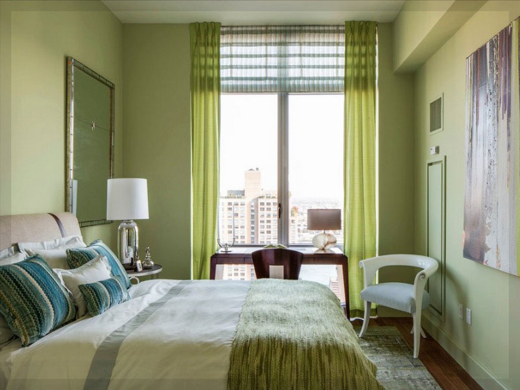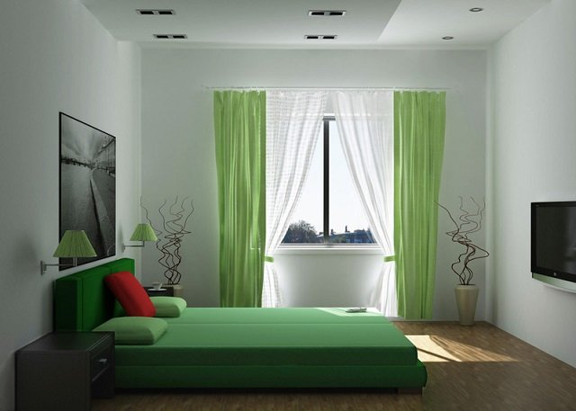 النغمات العشبية الزاهية في غرفة النوم غير مناسبة. لكن يجب ألا تتخلى تمامًا عن الألوان المثيرة. تضفي الألوان الخضراء الزاهية مزاجًا خاصًا على الغرفة وتغير حجمها بصريًا. على سبيل المثال ، يوسع ظل أوراق الشجر الصغيرة الغرفة بصريًا ، بينما ظل الجير ، على العكس من ذلك ، يقللها - يتم استخدامه فقط في الغرف الكبيرة. تعمل الألوان النصفية من اللون الأخضر ، القريبة من الألوان الصفراء الحمضية ، على تحفيز النشاط والعمل. الستائر الزرقاء والخضراء لها تأثير مهدئ.