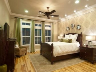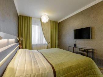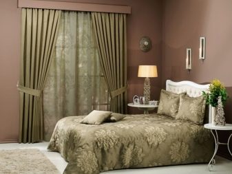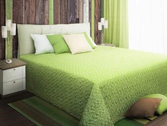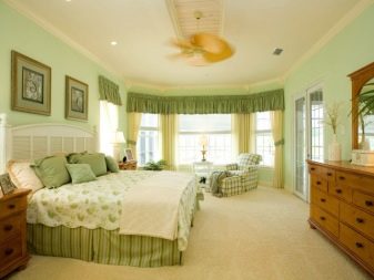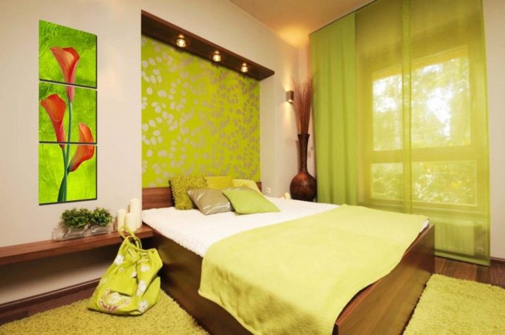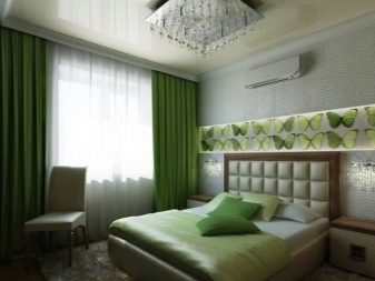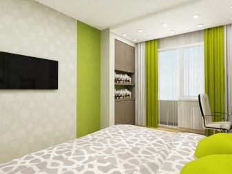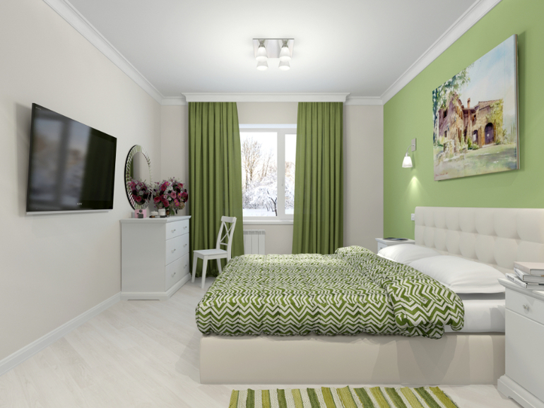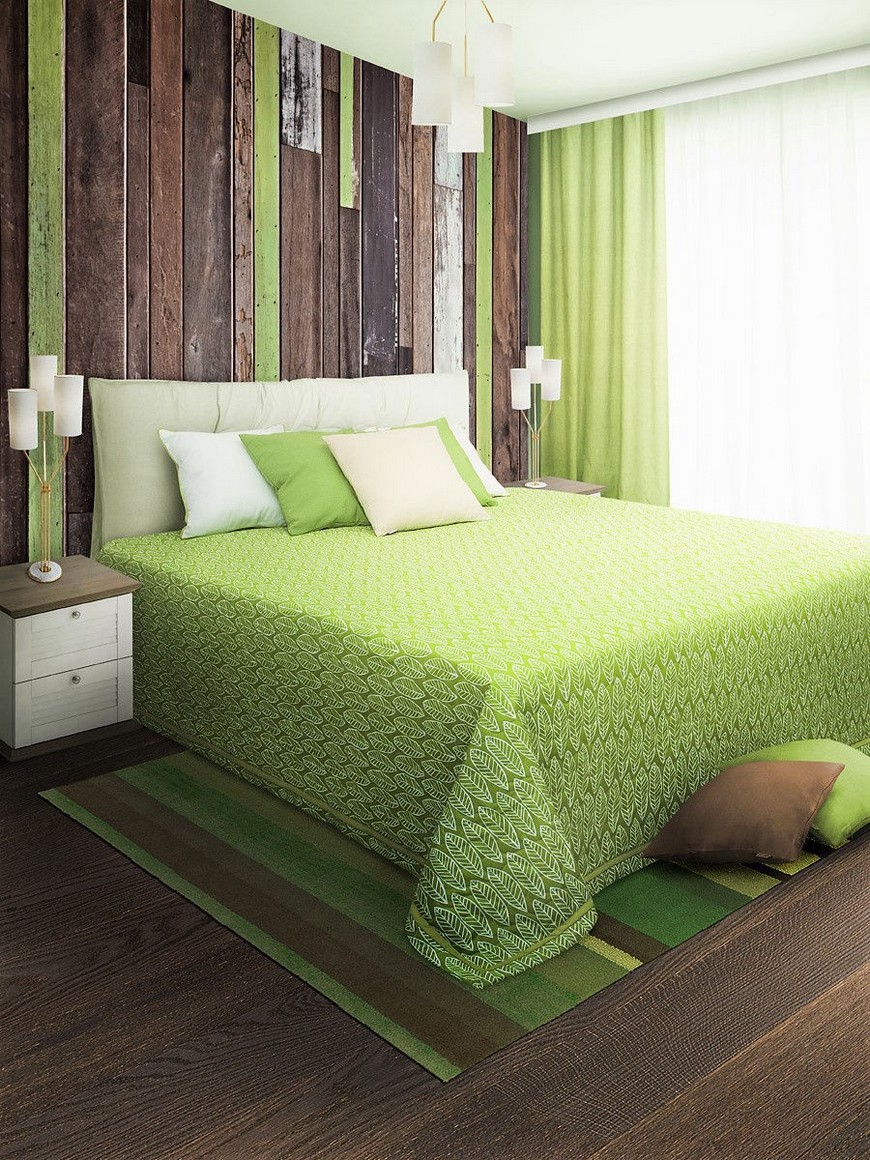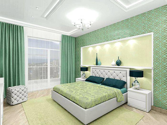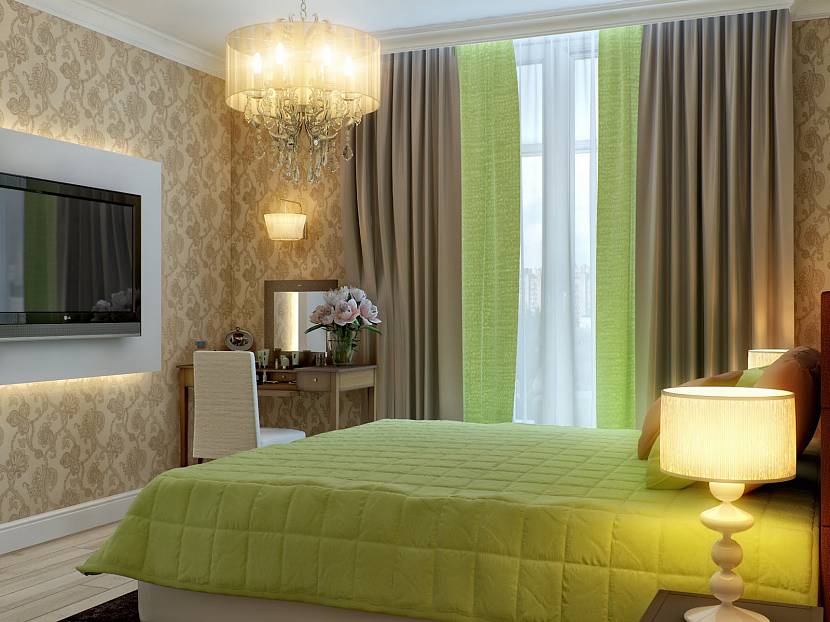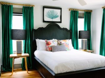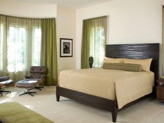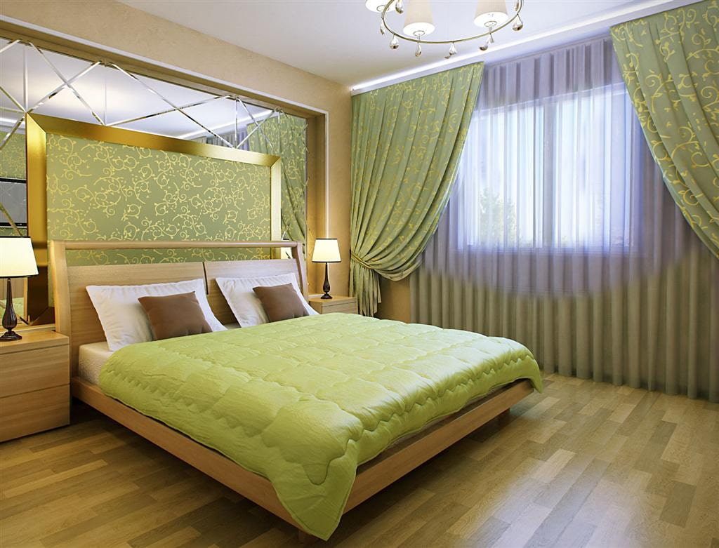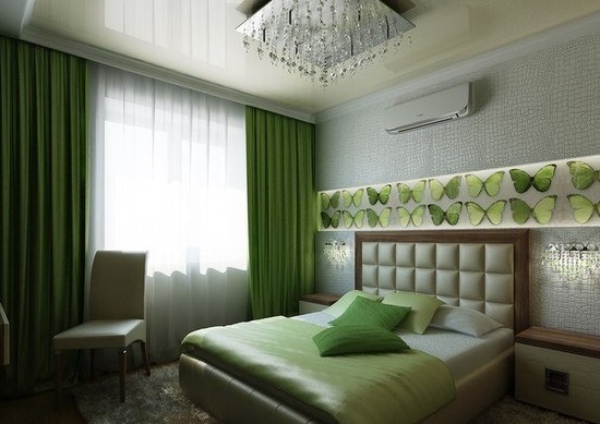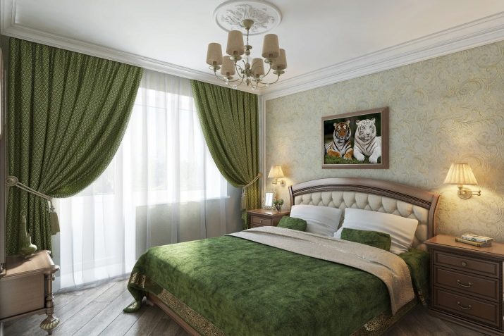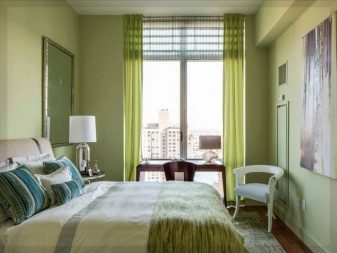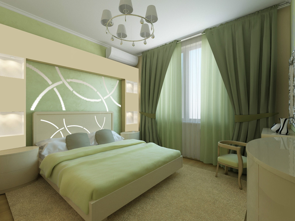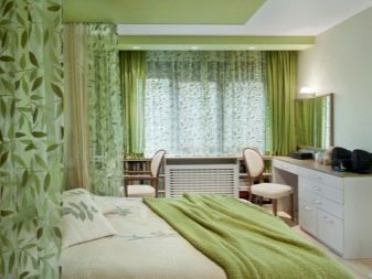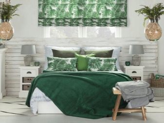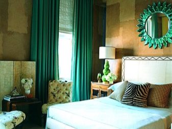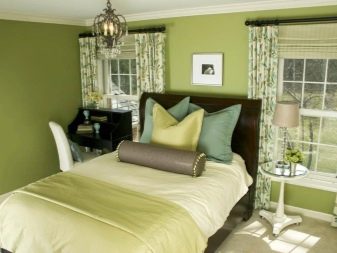 سيكون الحل الإبداعي إلى حد ما هو تزيين غرفة النوم بظلال مختلفة من اللون الأخضر. لذلك ، في غرفة مظلمة ، من الأفضل إعطاء الأفضلية للستائر ذات اللون الأخضر الفاتح. في أي حال ، يجب ألا تشتري ستائر من نفس النغمة مع ورق الحائط وبطانية على الأريكة - سيبدو هذا التصميم مملًا للغاية.