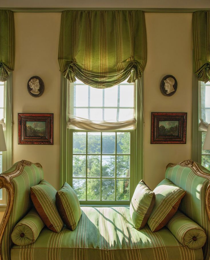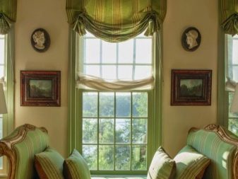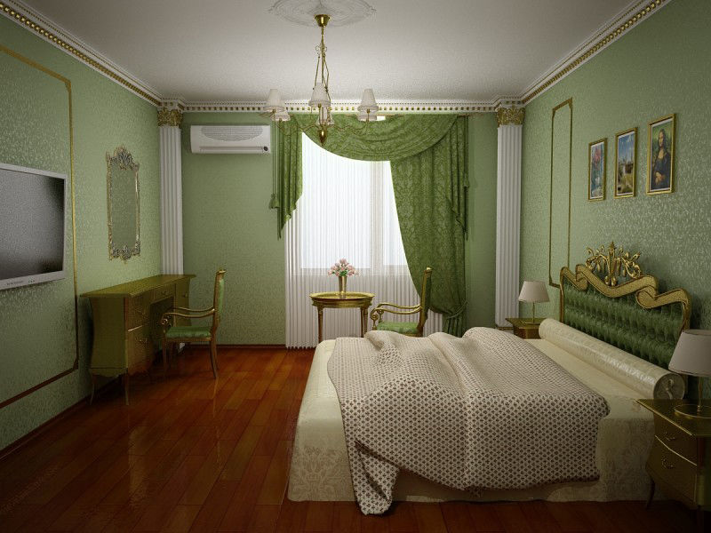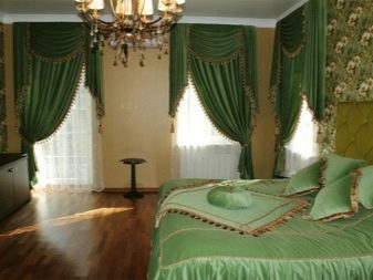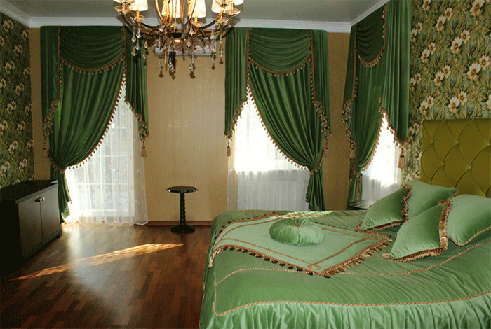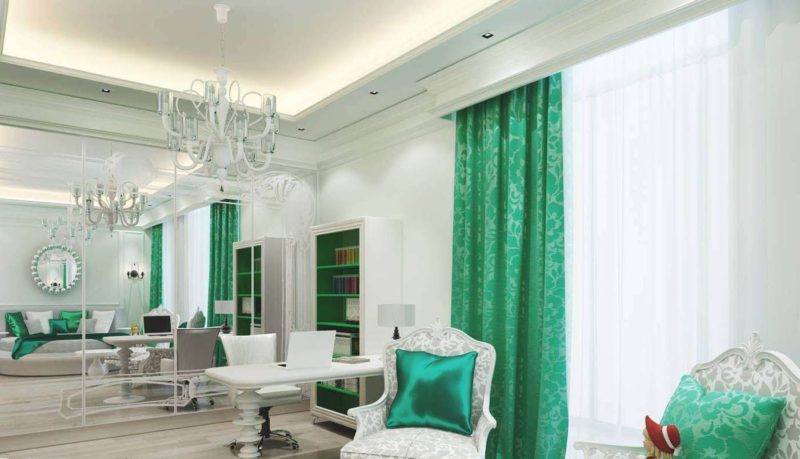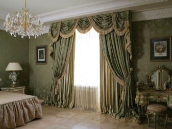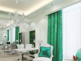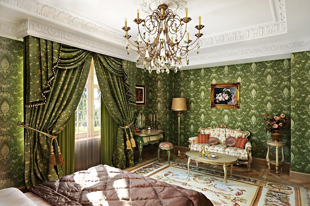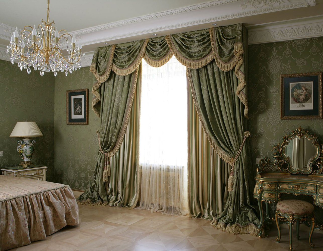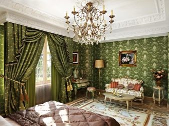 الديكور الكلاسيكي يوحي بأجواء باهظة الثمن. يستخدم ظلال من الخشب والعنبر والذهب - وهي أكثر تناغمًا مع درجات اليشم والزيتون والزمرد. عادة ما يتم تزيين فتحة النافذة بستائر ثقيلة مع مسكات و lambrequins. تبدو الستائر الخضراء أنيقة بشكل خاص مع المفروشات الداكنة والأثاث المذهب.