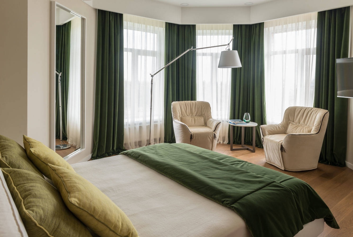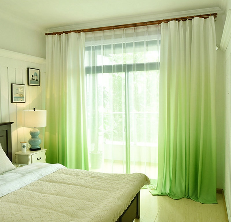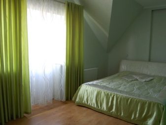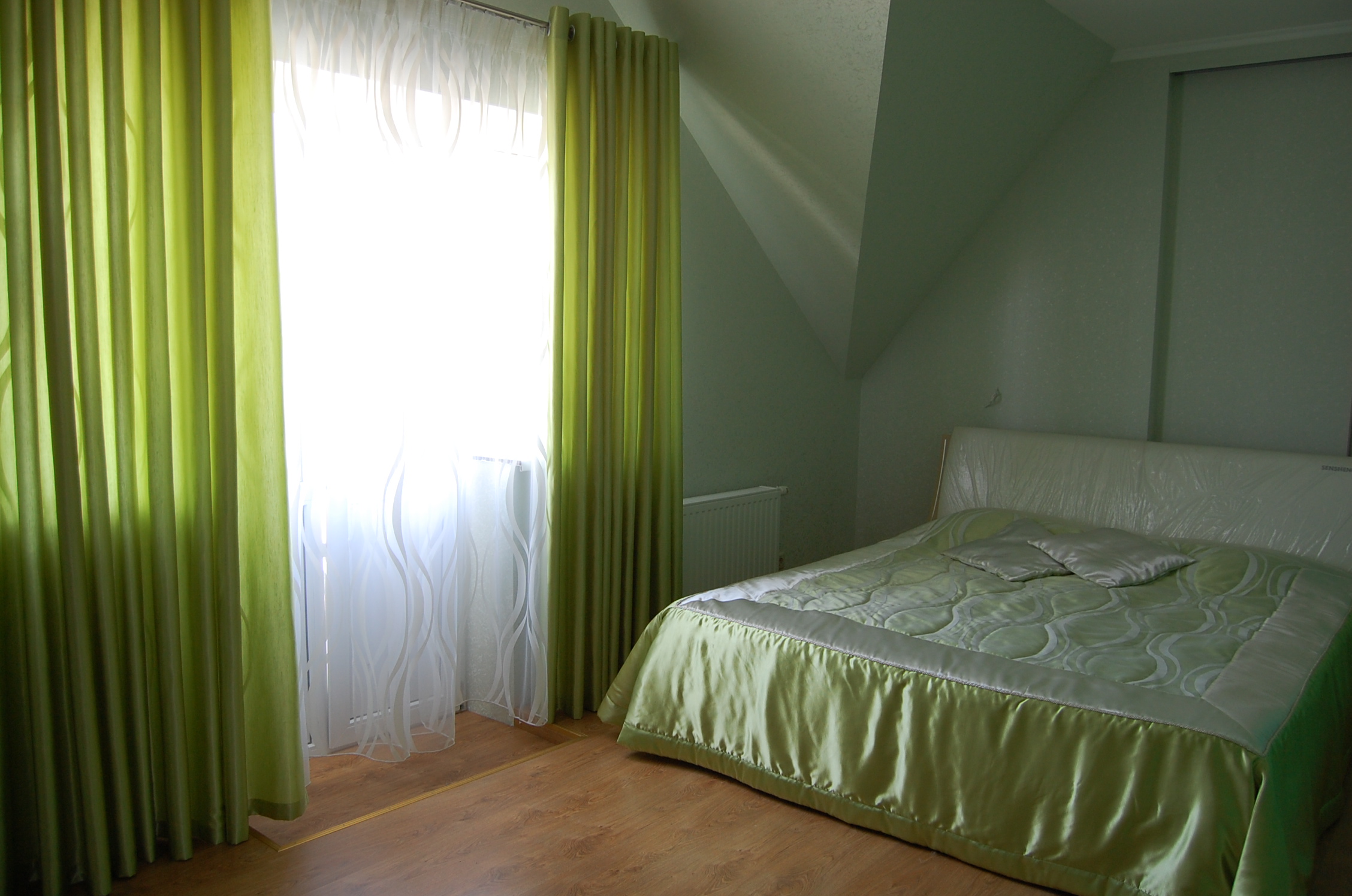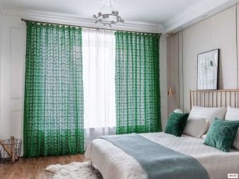 لا تؤدي الستائر في الداخل وظيفة زخرفية فحسب ، بل تحمي الغرفة أيضًا من اختراق الضوء. هذا هو السبب في أن التأثير قد يختلف عند استخدام أنواع مختلفة من المواد. على سبيل المثال، المادة الرقيقة جدًا ستحمي الغرفة من آراء الناس في الشارع ، لكنها في الوقت نفسه لن تخفيها عن الإضاءة الخارجية وتسمح لمصابيح السيارات المارة بالمرور. لذلك ، عند اختيار الستائر ، من المهم جدًا الانتباه ليس فقط إلى تشبع اللون الأخضر ، ولكن أيضًا لجودة القماش.