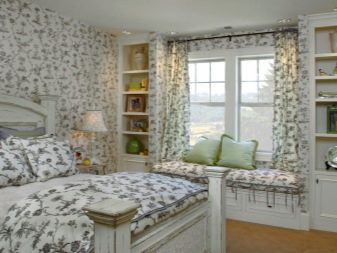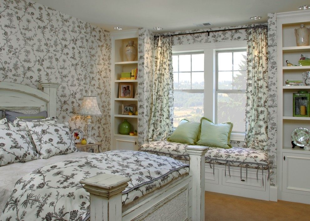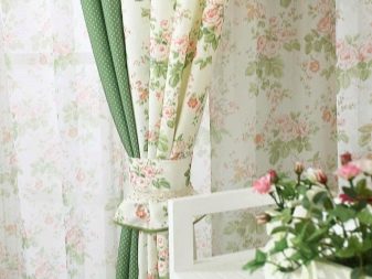 السمة المميزة لأسلوب بروفنسال هي المنسوجات ذات الأزهار المطبوعة. ستظهر الستائر البيجية ذات الزخرفة الخضراء الزهرية الصغيرة بشكل أفضل في مثل هذا التصميم الداخلي - ستحدد نغمة إقليمية في غرفة النوم ، وهي سمة من سمات هذا الاتجاه.