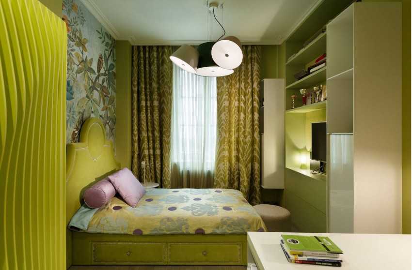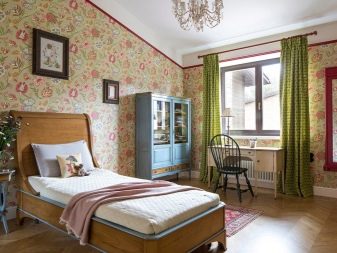سيساعد استخدام جميع أنواع الزخارف الزهرية والهندسية على تجنب الازدحام وإضفاء الحيوية على الجو. يعتبر ترادف سطح الجدار أحادي اللون مع نمط أخضر كبير على الستائر متناغمًا بشكل خاص.