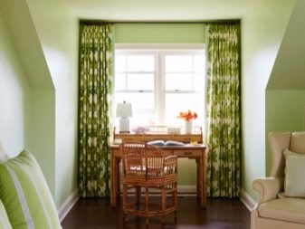 يمكن أن يكون استخدام ظل الفستق حلاً جيدًا. إنه ممتع بصريًا ويساعد على الاسترخاء - هذه النغمة مهيمنة في الداخل. يعمل مخطط الألوان بشكل مفيد بشكل خاص في الغرف الواقعة على الجانبين الشمالي والغربي. يساعد الظل على تكبير الغرفة بصريًا ، خاصةً إذا استكملت ستائر الفستق بورق حائط أخضر فاتح.
