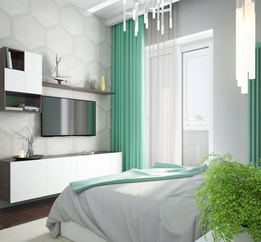 تبدو نغمة النعناع متناغمة مع الألوان الأخرى ، بحيث يمكنك إنشاء التصميمات الداخلية الأكثر إثارة للاهتمام. عند اختراق الغرفة ، تضيء أشعة الشمس اللوحة - وهذا يعطي توهجًا خاصًا ينتشر في جميع أنحاء غرفة النوم.