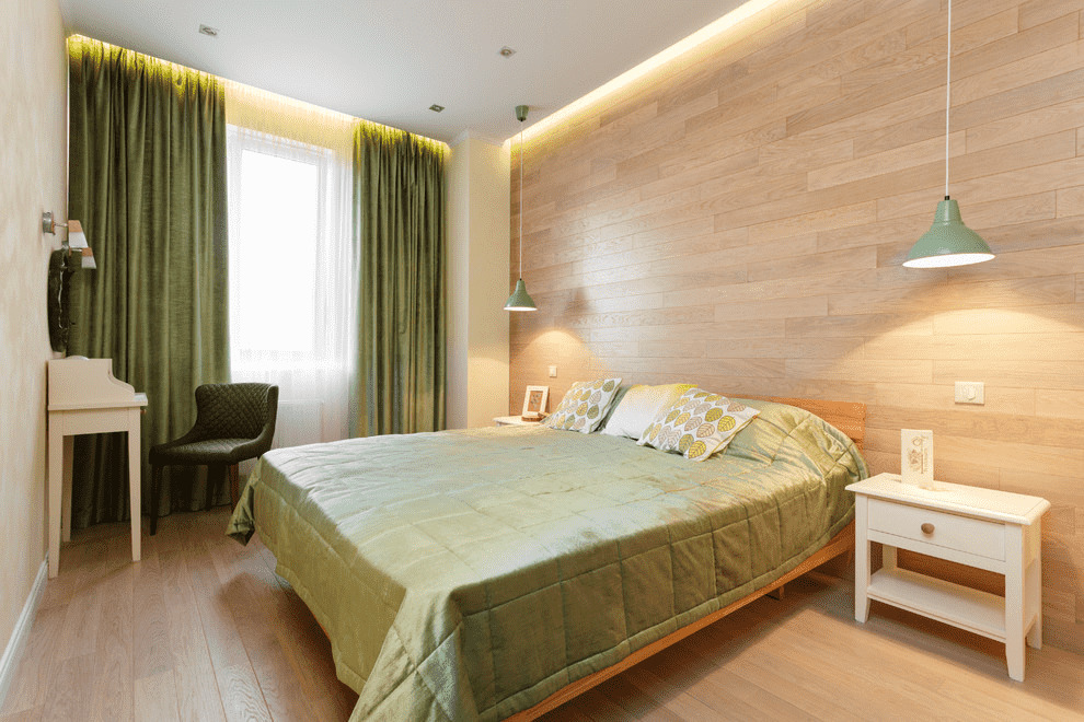 يعطي الخضر غرفة النوم إحساسًا ناعمًا ومشمسًا. عند تزيين غرف النوم ، عادةً ما يتم الجمع بين درجات اللون الأخضر الدافئة والألوان الطبيعية: