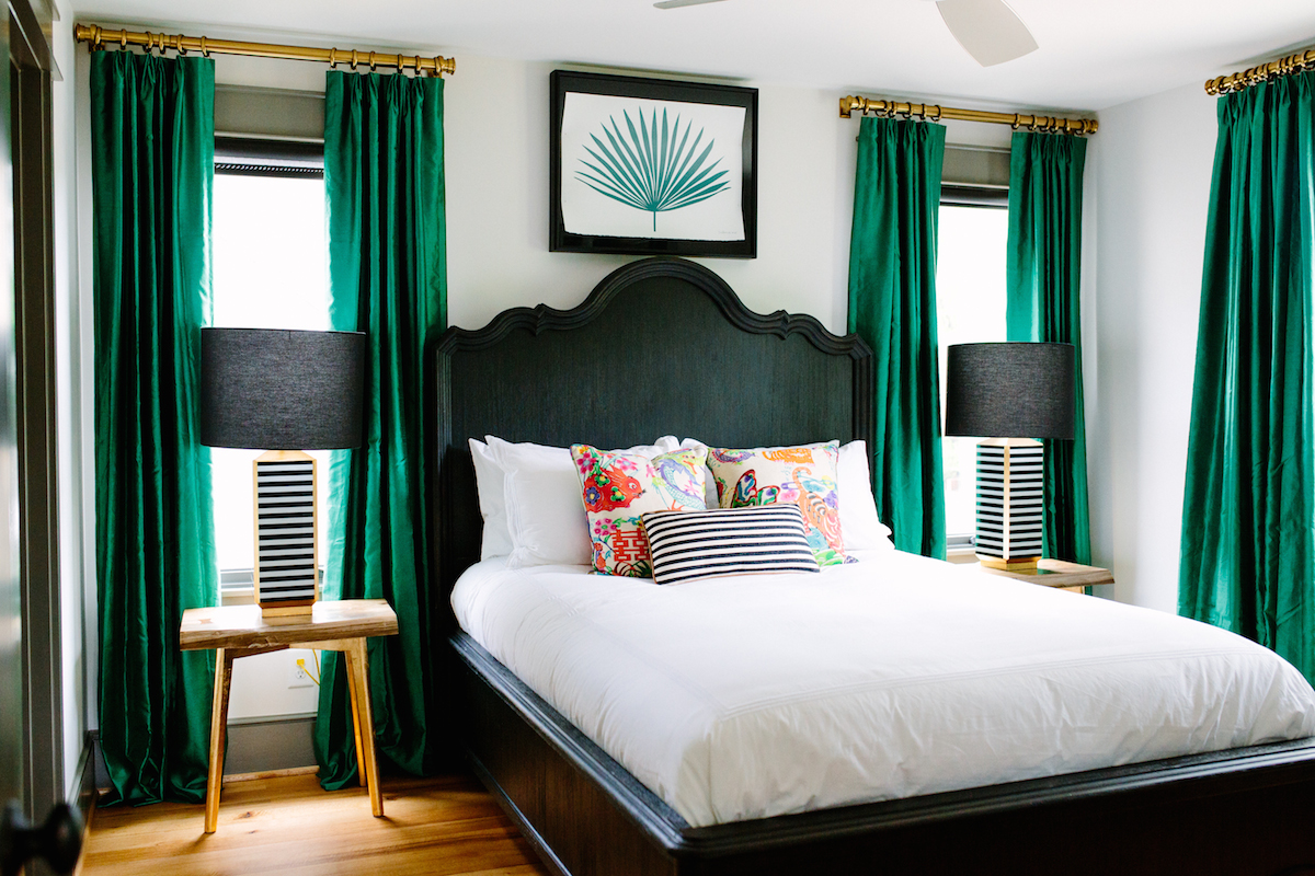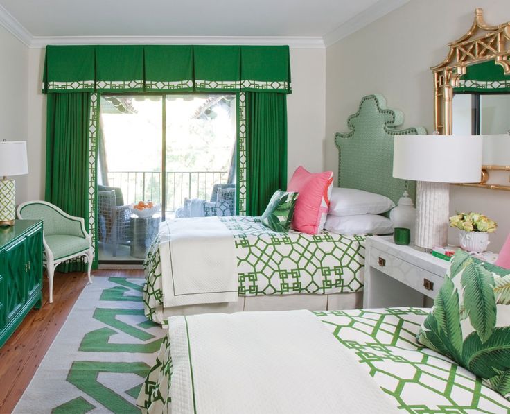 نقدم لكم مجموعة صغيرة من غرف النوم مزينة بستائر خضراء.