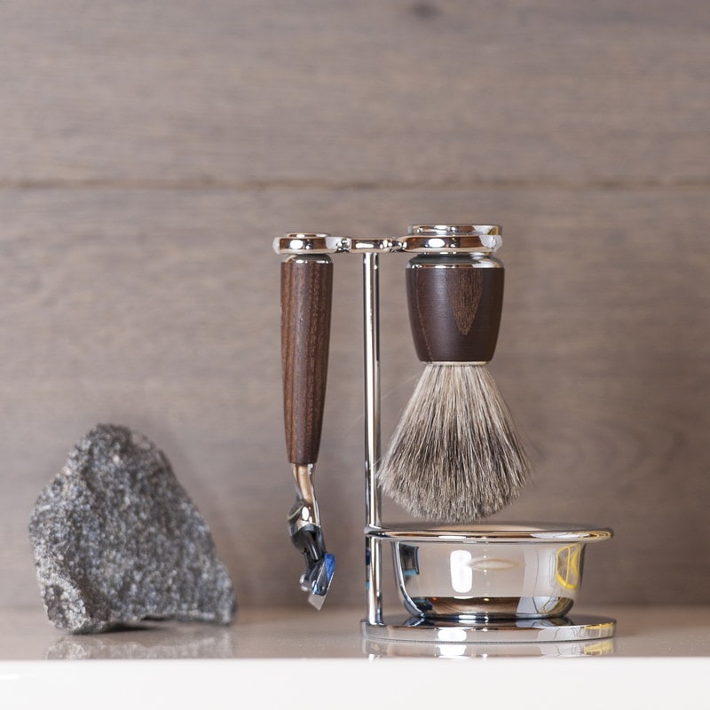 تشتهر شركة Muehle الألمانية بالجودة العالية لأجهزة الحلاقة ومستحضرات التجميل العضوية. لقد كان موجودًا في السوق منذ أكثر من 65 عامًا ، لكن شعيرات الغرير طويلة الأمد لا تزال مصنوعة يدويًا. أحد خطوط الإنتاج هو حامل خاص لماكينة الحلاقة وفرشاة وأوعية. ستصنع الأوعية من البورسلين والفولاذ المطلي بالكروم. مجموعات النخبة من Muehle ليست مجرد هدية رائعة ، فهي قادرة على تزيين داخل الحمام. للمسافر ، تقدم العلامة التجارية مجموعة سفر أنيقة في حقيبة جلدية مدمجة.