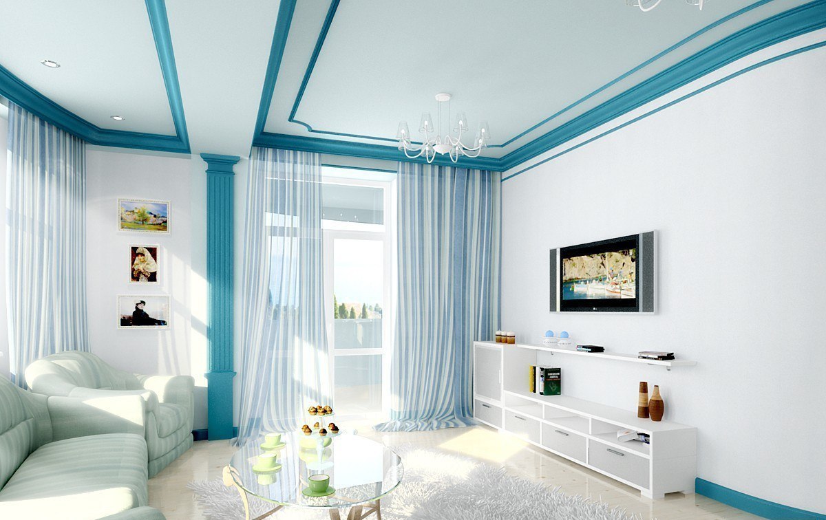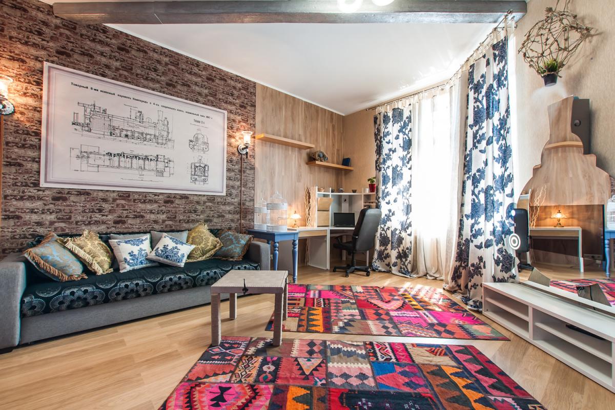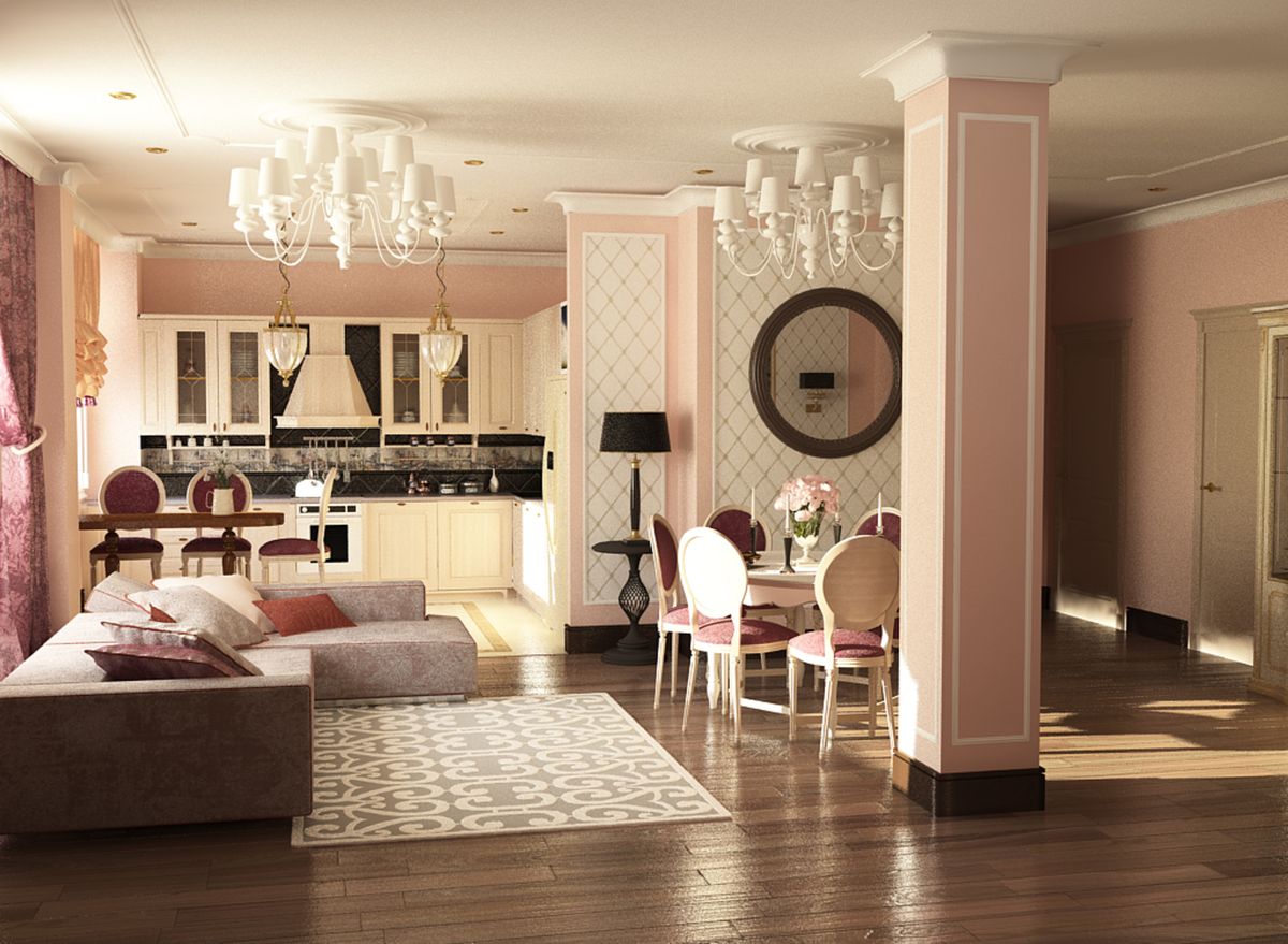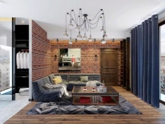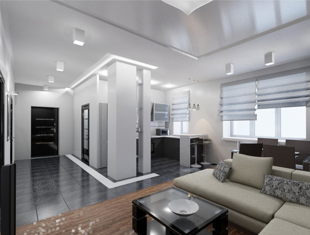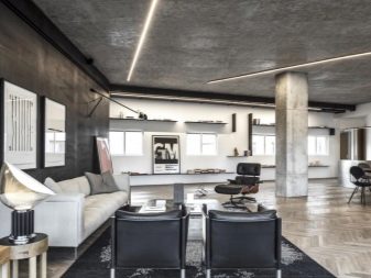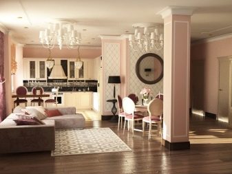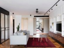 - يمكن أن يكون الحل الجذاب للغاية هو غرفة المعيشة: بسقف خشن بصريًا وسجادة على الأرض وعمود زخرفي.