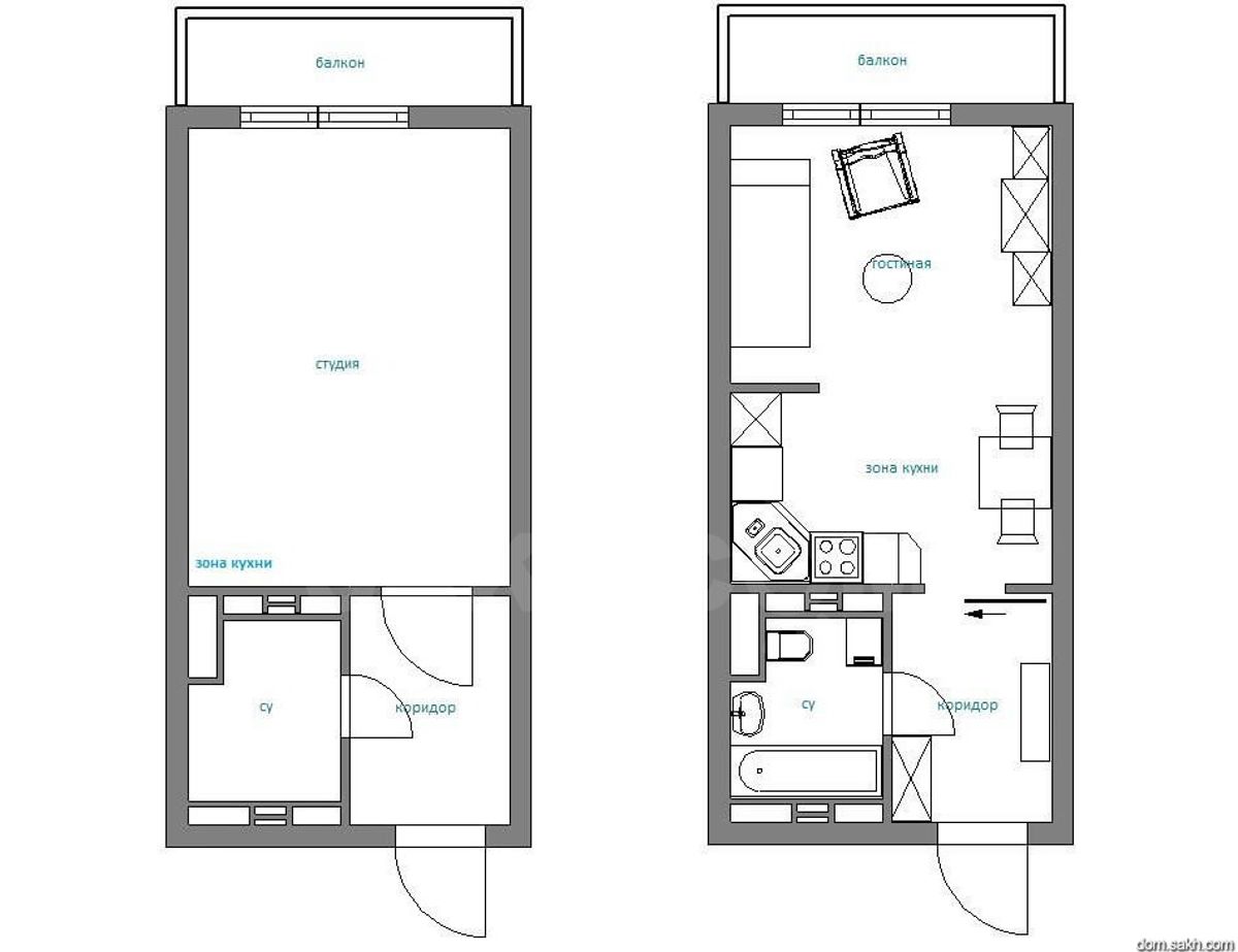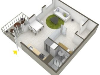 المدخل في هذا الإصدار معزول بقسم. الأمور مختلفة قليلاً مع الاستوديو المستطيل. لا توجد المناطق الرئيسية بالقرب من بعضها البعض ، ولكن بالتتابع. هذا يساعد على تلطيف تأثير مقلمة القلم. يتم تشجيع استخدام الرفوف الطويلة والأرفف المعلقة والخزائن.