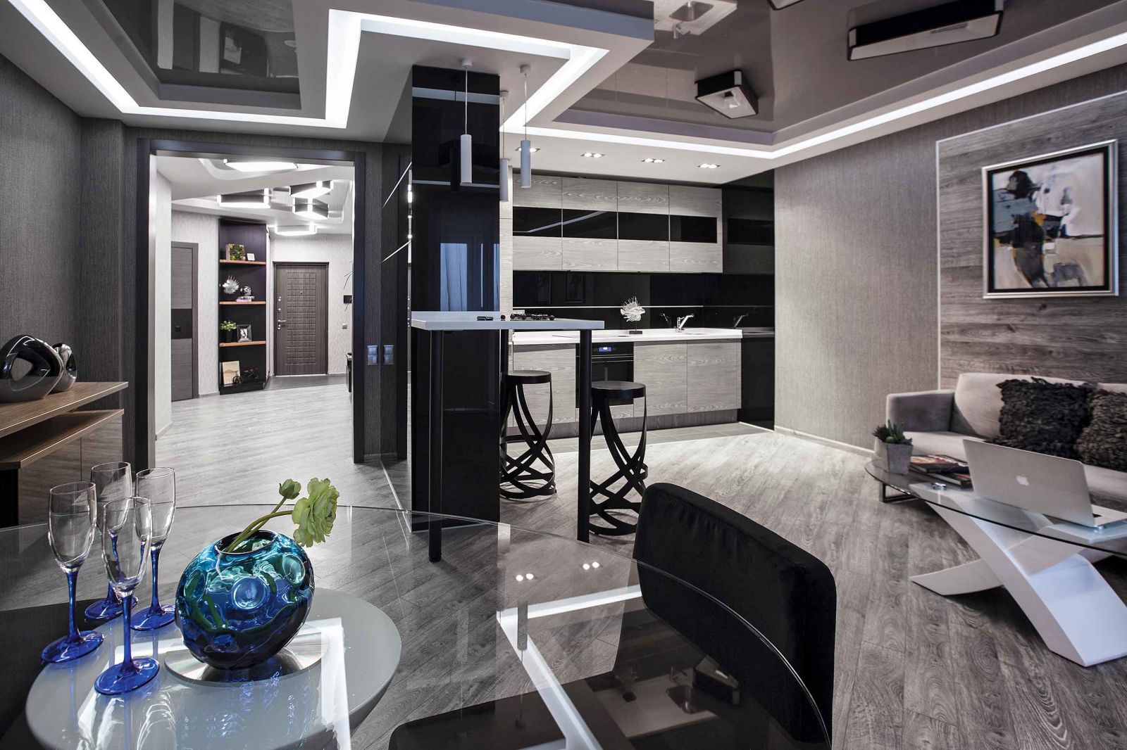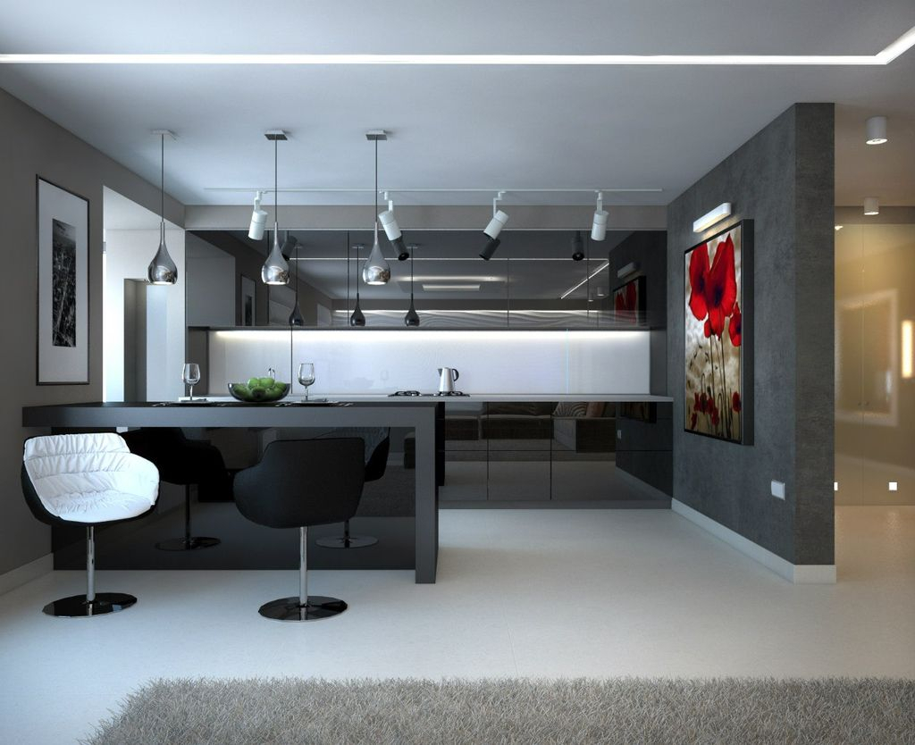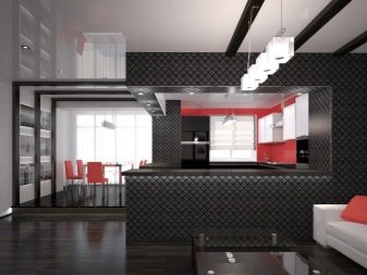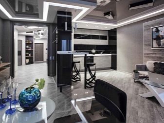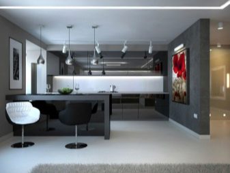 مع هيمنة النغمات الداكنة في الشقة ، يجب عليهم استخدام الإضاءة المحلية. يتم تحقيق اللمسات البارزة على النحو الأمثل باستخدام وحدات الإنارة الملونة. على أي حال ، فإن ظهور المناطق ذات الظلال العميقة أمر غير مقبول. لجعل التوهج أكثر نعومة ، يُنصح بوضع مصادره داخل السقف وفي مجموعات المطبخ وتحت الخزائن المعلقة.