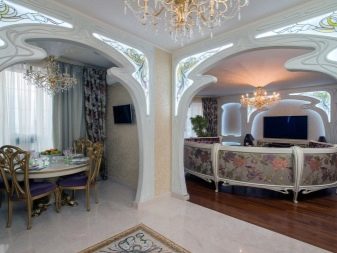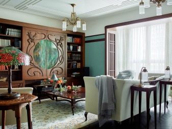بالطبع ، لا تقتصر إمكانيات التصميم على الأنماط المدرجة. يمكن أن يكون أسلوب فن الآرت نوفو مفيدًا جدًا. سوف يروق لأولئك الذين يحبون الخطوط الناعمة والوئام الناعم. يوصى باستخدام الخشب الصلب ، والأنواع القيمة.