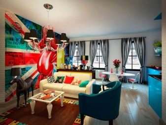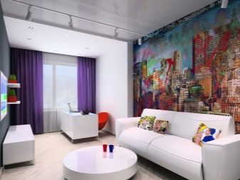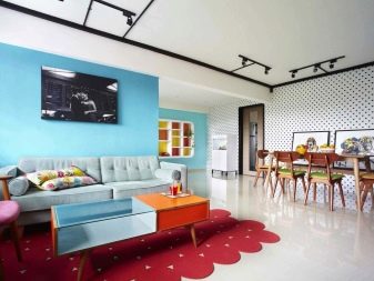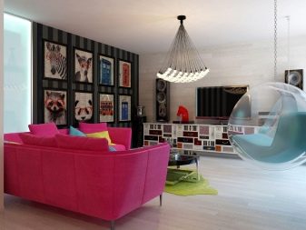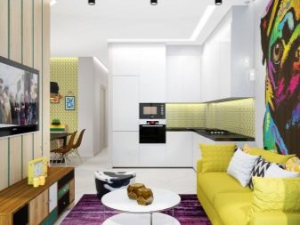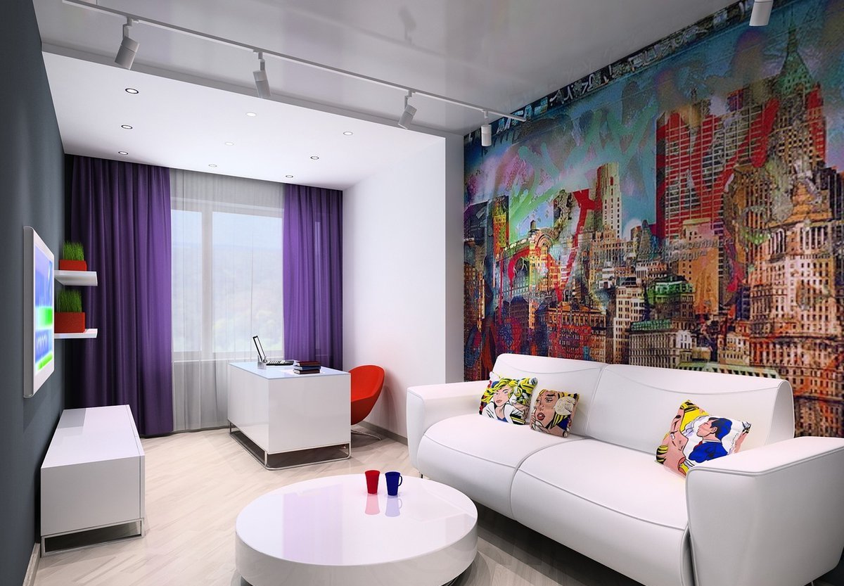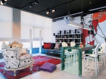 فن البوب \ u200b \ u200b ليس سيئًا أيضًا. في بيئة الاستوديو ، يكون الأثاث المدمج والقابل للتحويل الذي يوفره مقبولًا تمامًا. هذه هي الحالة النادرة عندما لا يكون استخدام النغمات الحمضية مقبولًا فحسب ، بل ضروريًا أيضًا. يستخدمون مصابيح LED للإضاءة ، ولكن الأكثر أصالة هي مصابيح النيون. الوضع العام مشرق وشبابي. سيساعد إنشاء الموقف الضروري:
