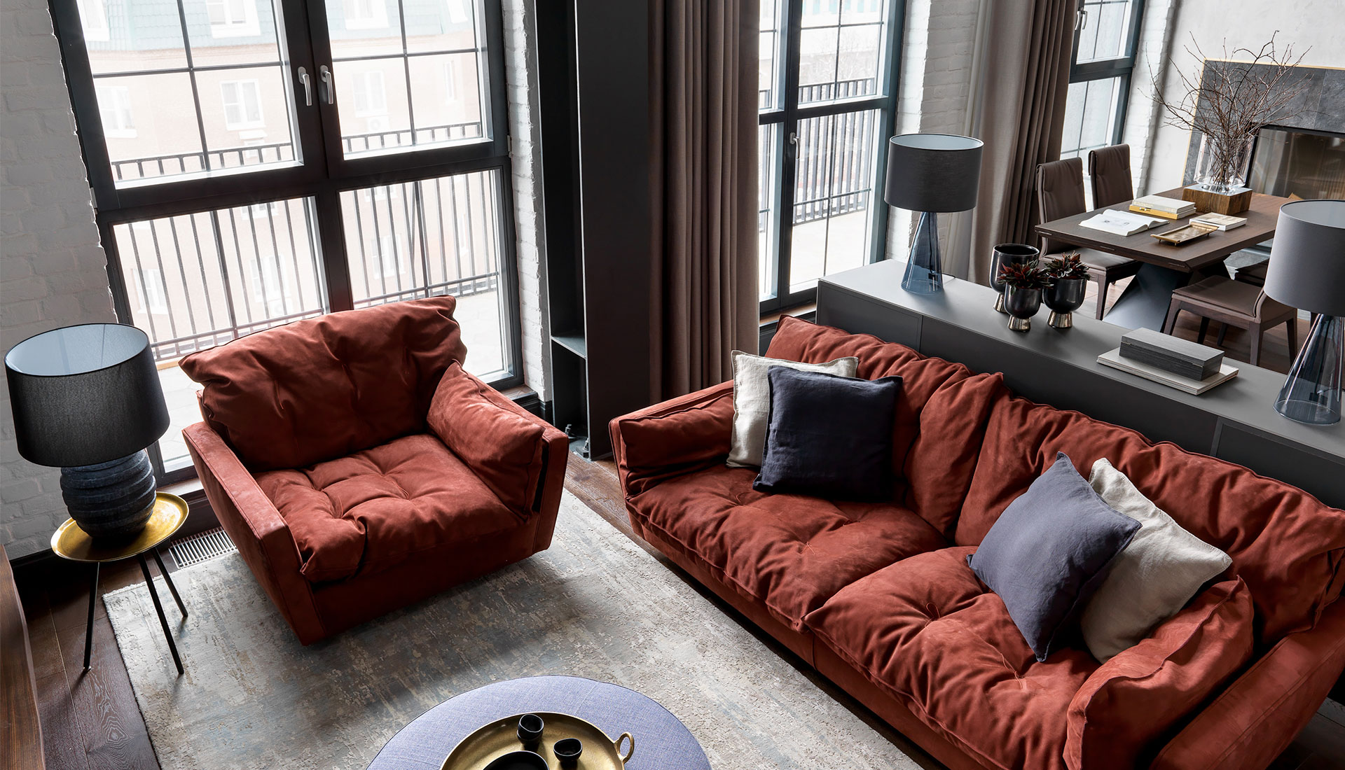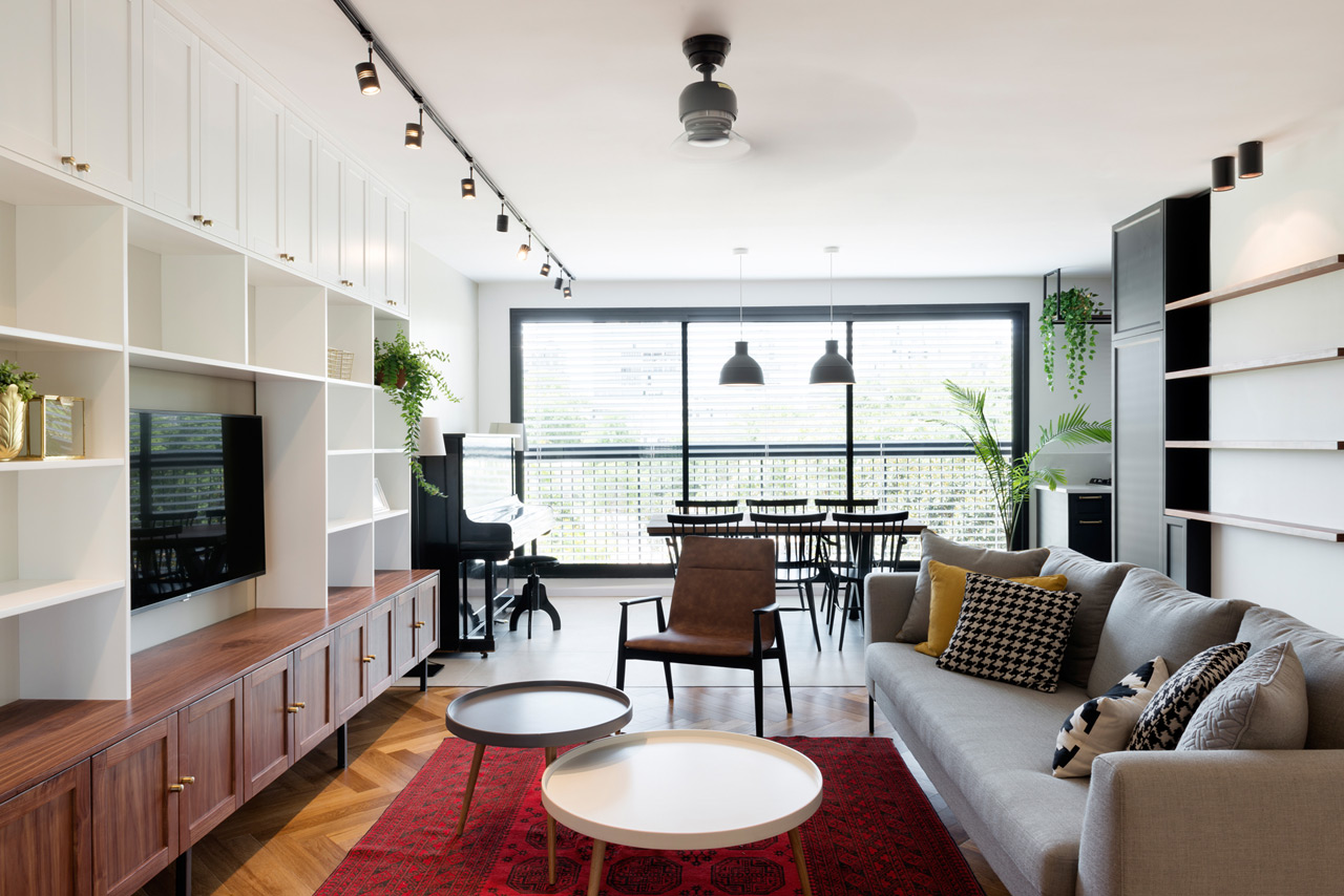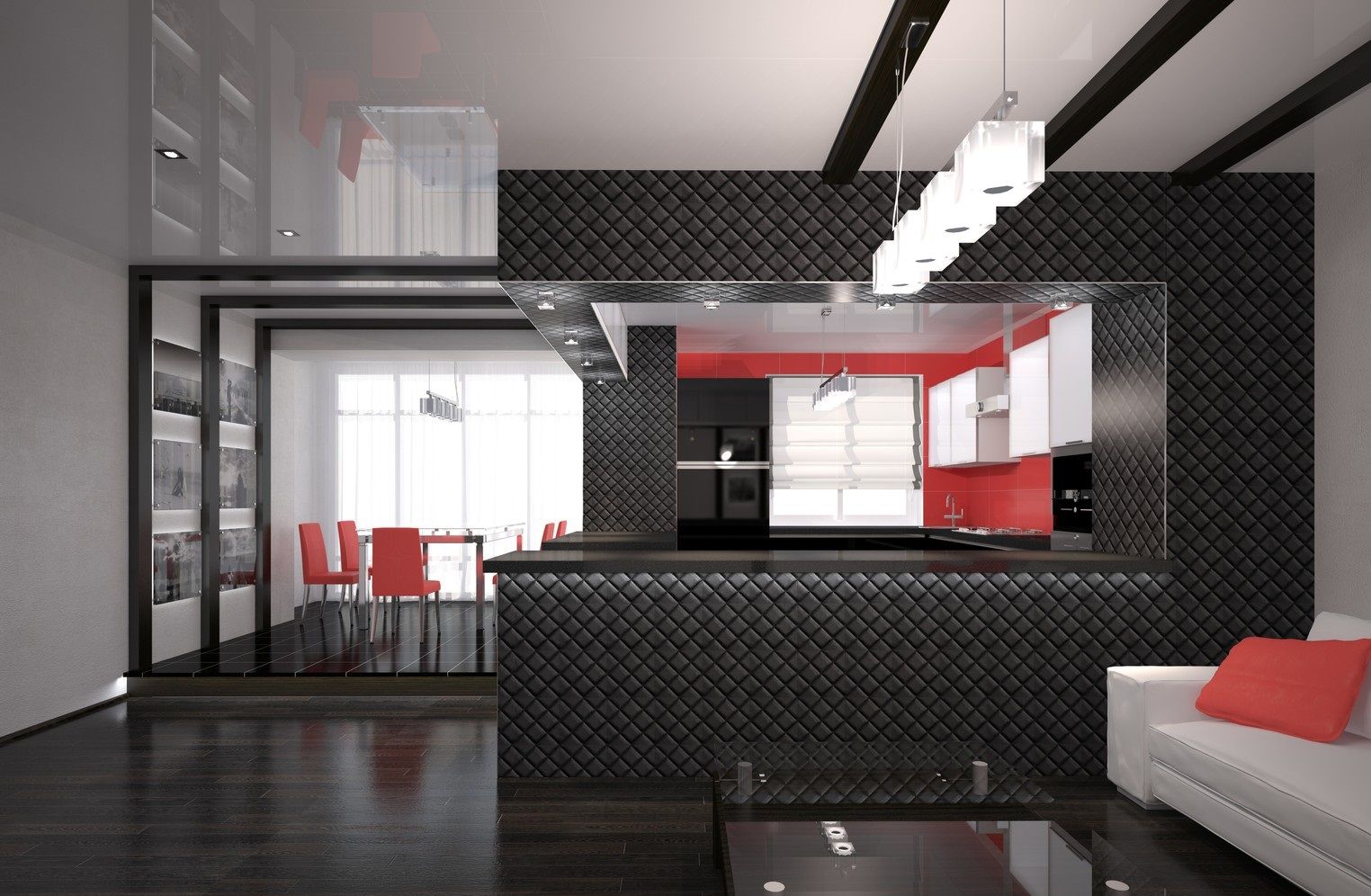 - تُظهر الصورة مزيجًا أنيقًا من المطبخ باللونين الأحمر والأبيض مع زاوية رمادية داكنة لقضاء وقت الفراغ. يفصل بينهما خزانة ملابس سوداء كبيرة وغنية.