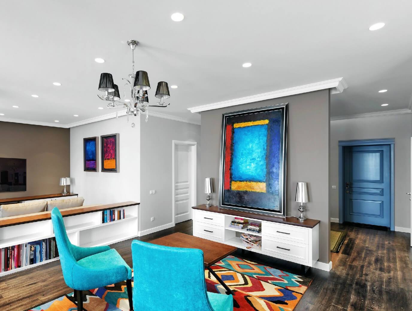 في منطقة الضيوف ، تعتبر الأقمشة الغنية بالألوان مناسبة. في بعض الأحيان يتم وضع لهجات على وسائد الأريكة. لكن استخدام ثلاثة أو أربعة ألوان أو أكثر في نفس الوقت بالكاد مبرر. يمكن فقط للمصممين ذوي الخبرة العالية تنسيق كل هذا بشكل لا تشوبه شائبة. بالنسبة للعناصر الزخرفية ، يبرز ما يلي: