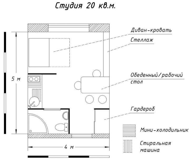 في هذا الرسم ، يمكنك معرفة كيفية ترتيب شقة استوديو بأبعاد 4 و 5 أمتار.