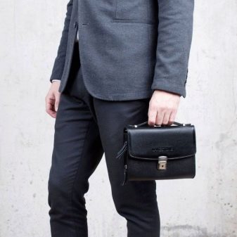 تلتزم لوحة الظل اللاكونية دائمًا باتجاهات الموضة الرجالية. تنتمي الأسبقية المطلقة إلى الملحقات السوداء ، والتي تكمل تمامًا القوس التجاري. تبدو هذه الحقيبة مناسبة في أي موقف ، فهي تؤكد على فرض صاحبها والذوق الرفيع.
