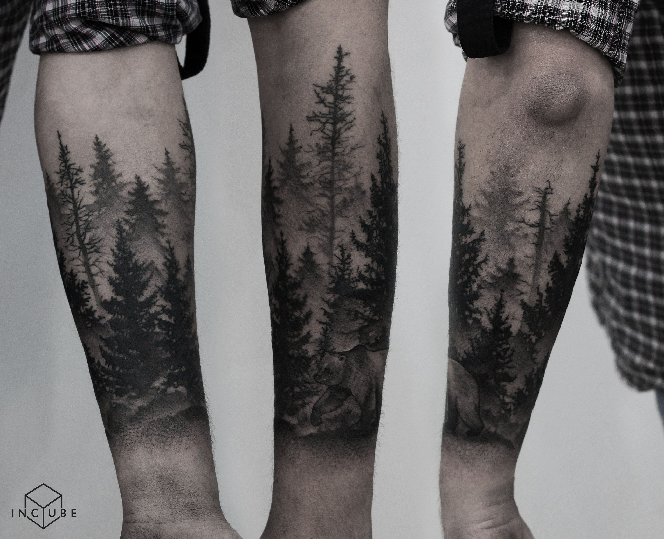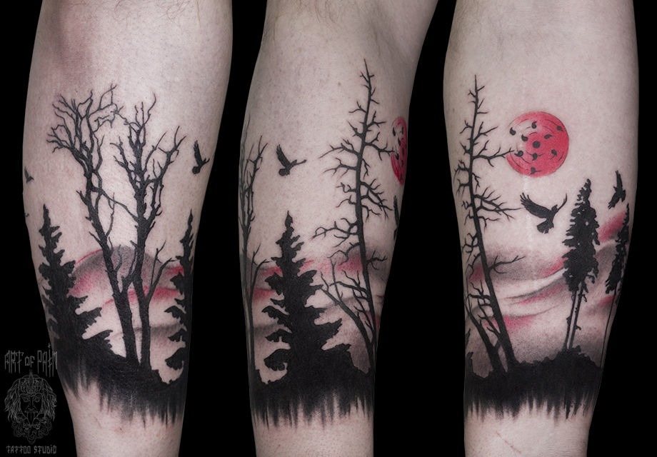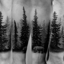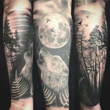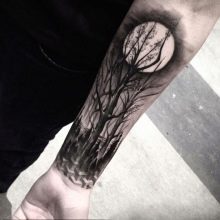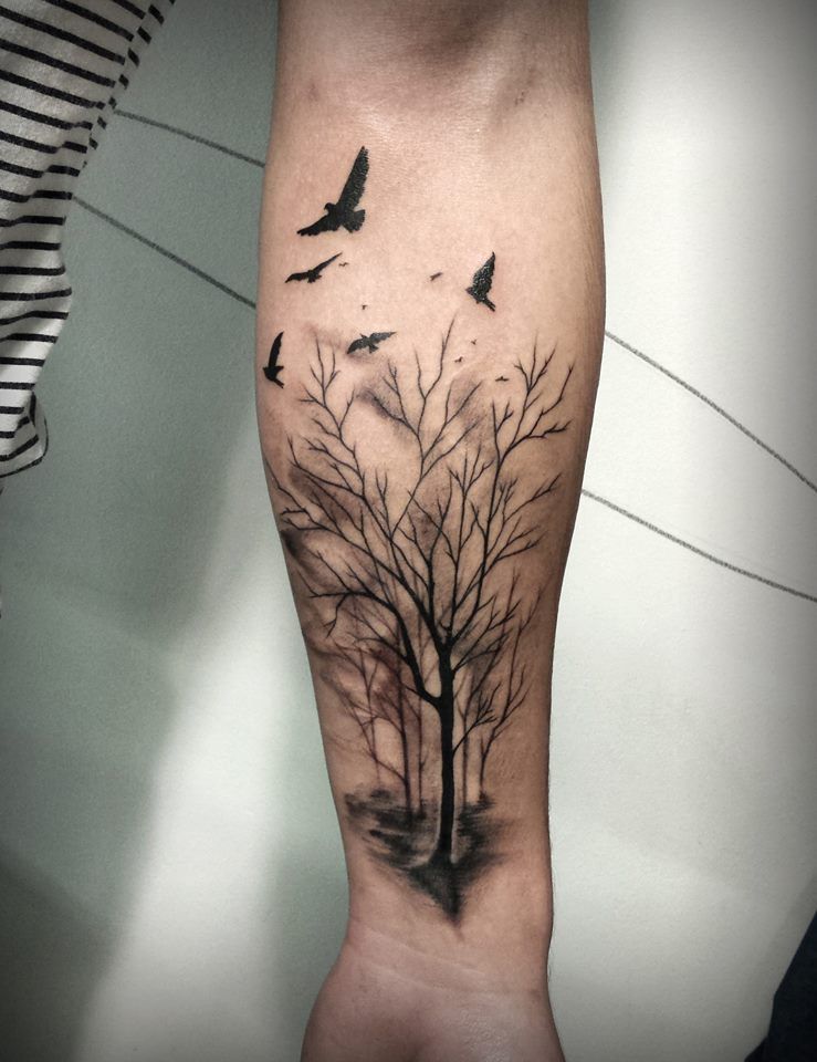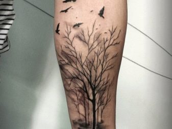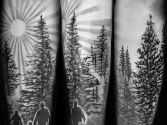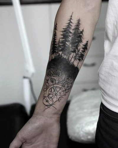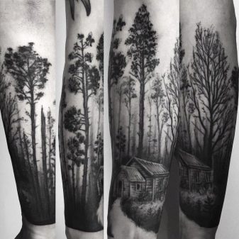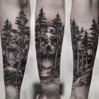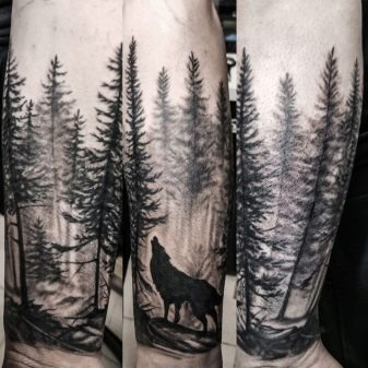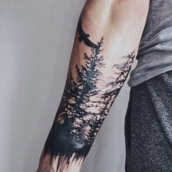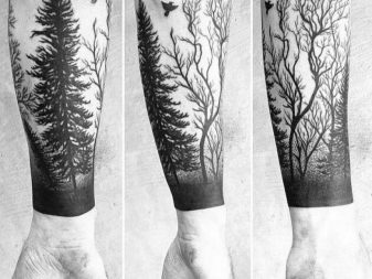 وشم الغابات فعال للغاية في حد ذاته. ويوفر تفردها القدرة على إضافة مجموعة متنوعة من الرموز وخلطها معًا. يكفي تضمين عنصر إضافي في الصورة ، وتكتسب الصورة معنى أعمق. الغابة في الطبيعة ليست أشجارًا فقط. يمكن ربط الظروف الطبيعية: غابة مشمسة وعاصفة رعدية ومطر.