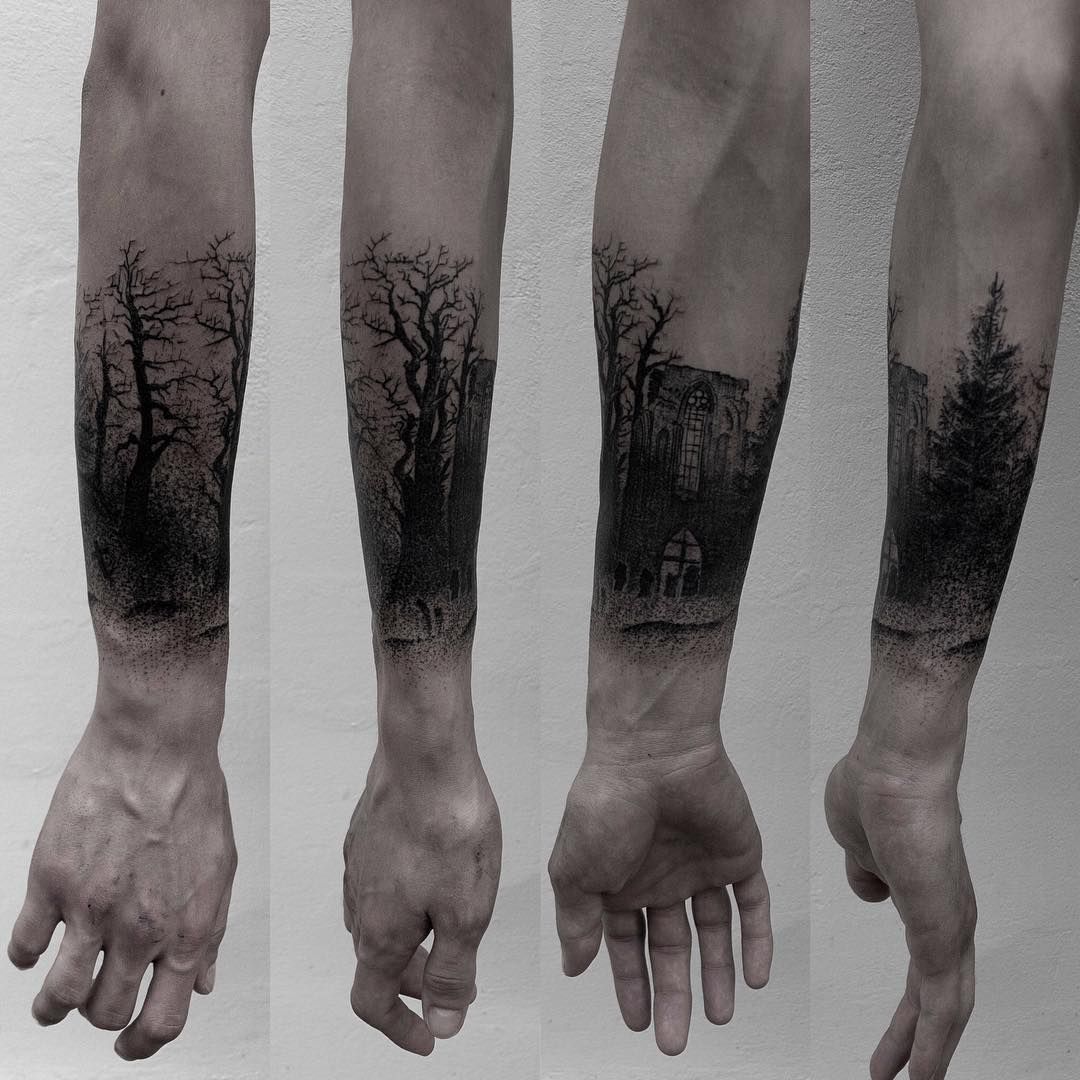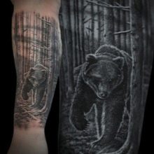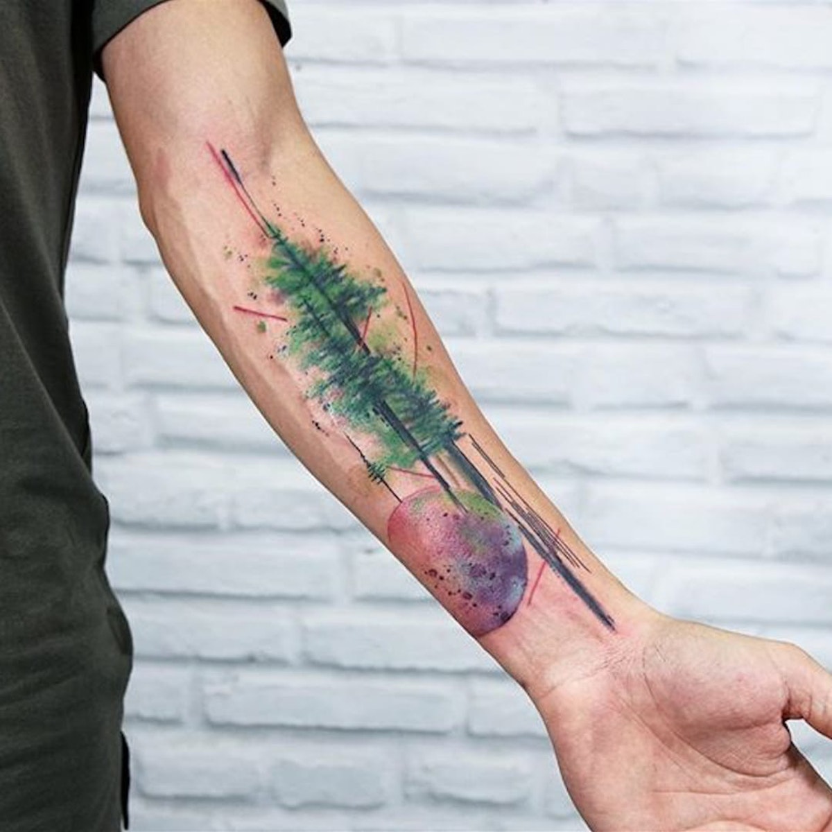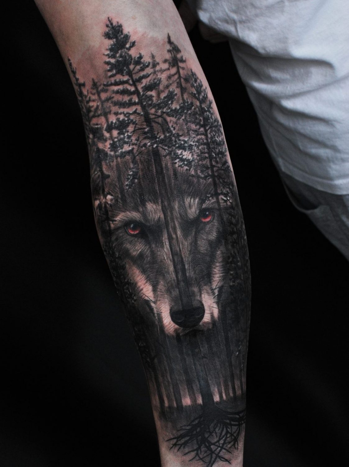 وشم الغابات فعال للغاية في حد ذاته. ويوفر تفردها القدرة على إضافة مجموعة متنوعة من الرموز وخلطها معًا. يكفي تضمين عنصر إضافي في الصورة ، وتكتسب الصورة معنى أعمق. الغابة في الطبيعة ليست أشجارًا فقط. يمكن ربط الظروف الطبيعية: غابة مشمسة وعاصفة رعدية ومطر.