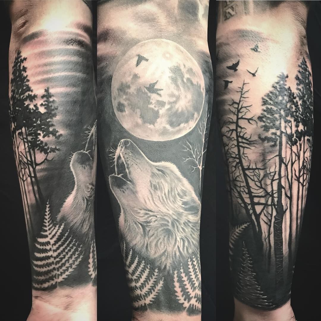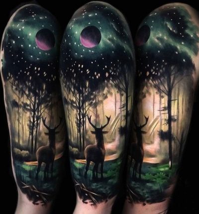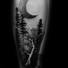 - قمر. يعتبر الجمع بين القمر والغابة أمرًا تقليديًا في فن الوشم. يرفع القمر درجة التصوف والغموض ، ويمكن أن يخلق مزاجًا كئيبًا. ومع ذلك ، غالبًا ما يتم تصوير القمر على خلفية غابة مظلمة كمصدر للأمل والضوء.