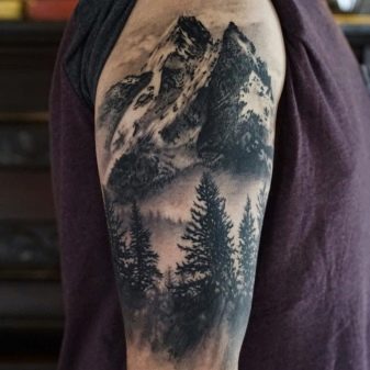 - على الكتف. ترتبط هذه المنطقة بالقوة الذكورية ، لذلك يتم اختيارها من قبل أولئك الذين يريدون إظهار الشكل الممتاز. في هذه الحالة ، يتم دمج النموذج مع لون عاطفي.في هذه المنطقة ، يتم ملء الأوشام من قبل الرجال الذين يريدون إظهار أنفسهم من الجانب الإيجابي لتحسين صورتهم. هنا تبدو الأوشام بأي شكل من الأشكال الفاخرة. غابة في أداء ملون إيجابي أو قاتم على الكتف مناسبة تمامًا. سيكون المعلم المحترف قادرًا على وضع الصورة بشكل مربح ، مع مراعاة جميع النقوش ، وزيادة درجة الفردية.