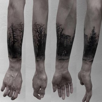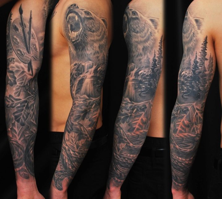 - تكميم. عندما تكون اليد مغطاة بالكامل بنمط غابة ، يمكن أن تكون سوداء أو قاتمة أو أكثر إيجابية. لمضاعفة التأثير ، يحصل بعض الرجال على وشم على كلا الذراعين.