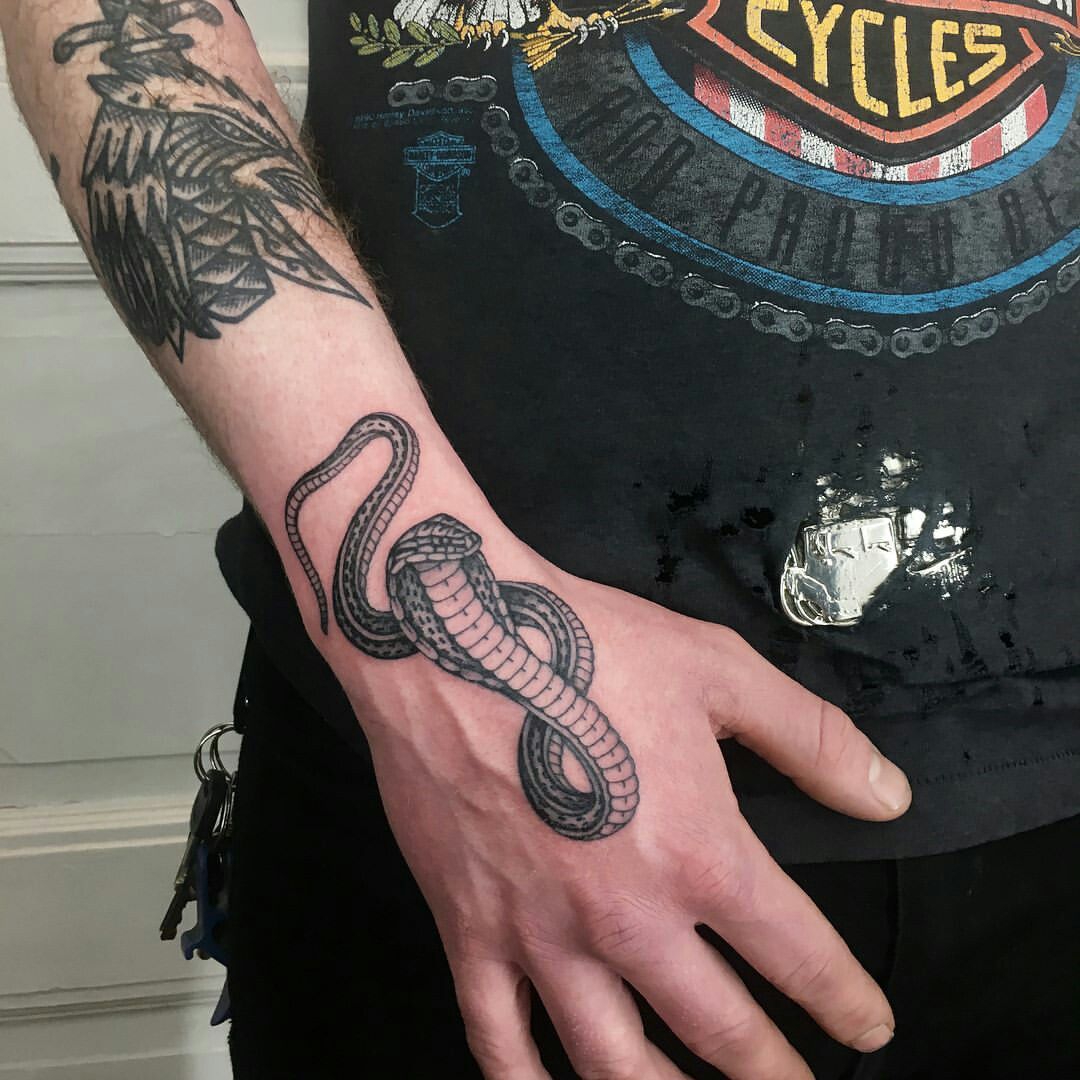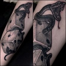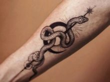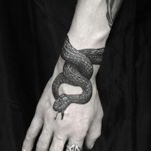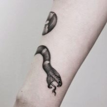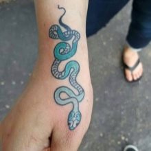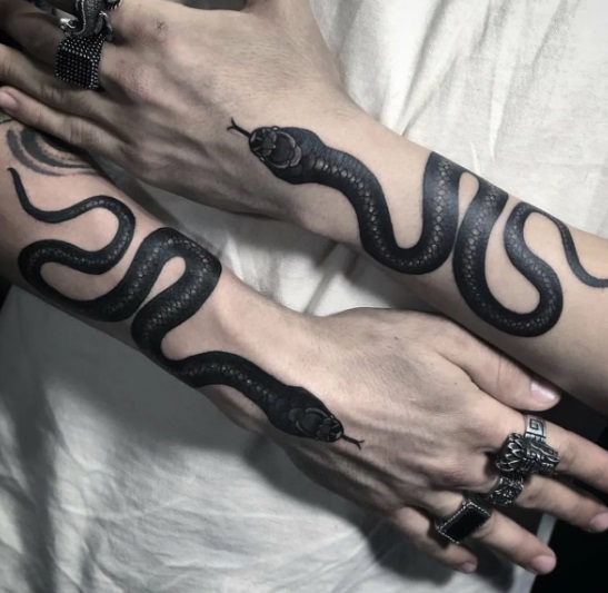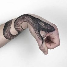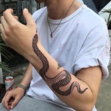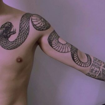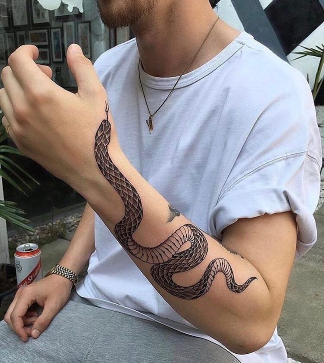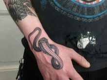 تبدو الأوشام الرجالية ذات الثعابين الموجودة على الذراعين مثيرة للاهتمام أيضًا. يمكن ختم النمط على الرسغ أو ظهر اليد أو حتى على الأصابع. تبدو الأوشام مع صورة ثعبان ملتوية حول الذراع جميلة. يعتقد بعض الناس أيضًا أنه من خلال الطباعة على هذا الجزء من الجسم ، يمكنك حماية نفسك من التأثيرات السيئة.