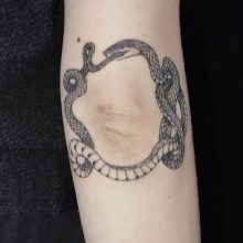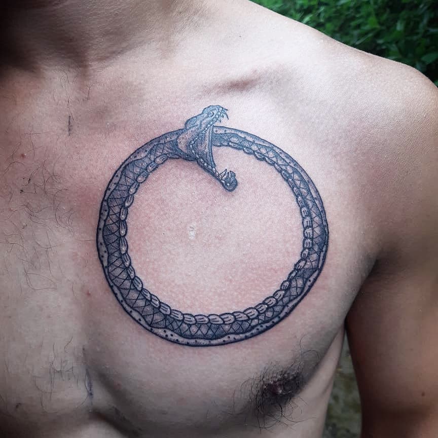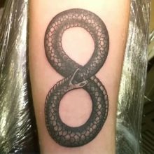 - أوروبوروس. صورة الثعبان يعض ذيله هو رمز قوي. يرغب الكثير من الرجال في الحصول على مثل هذا الوشم على رقبتهم أو أذرعهم أو أكتافهم. سيبدو كل من الرسم الكلاسيكي والمصنوع على شكل علامة اللانهاية جميلًا على الجسم.