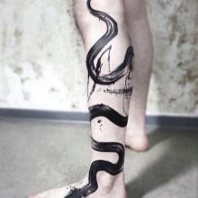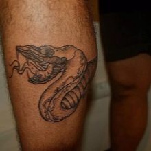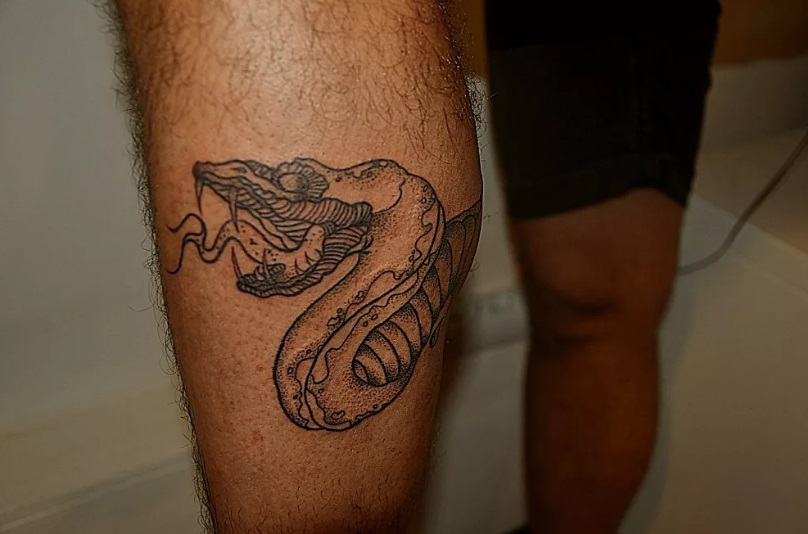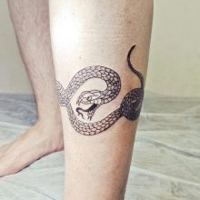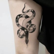 غالبًا ما يتم وشم الثعابين على الفخذين من قبل الفتيات. غالبًا ما يكون لدى الرجال مثل هذه الأنماط على ساقهم. عادة ، يتم وضع الوشم هناك. ستبدو الرسومات التي تحتوي على صورة ثعبان يلتف حول خنجر أو سهم أو نوع من الزهور جميلة على الساقين.