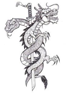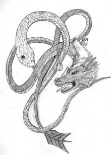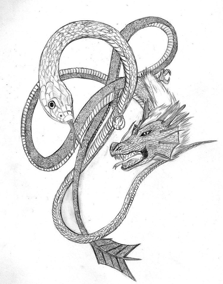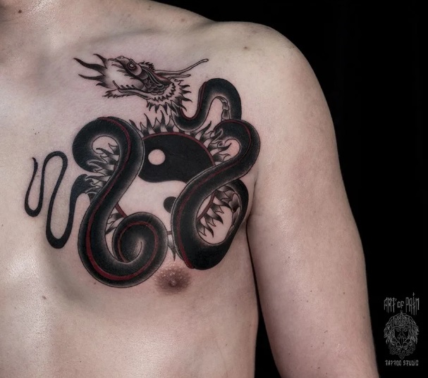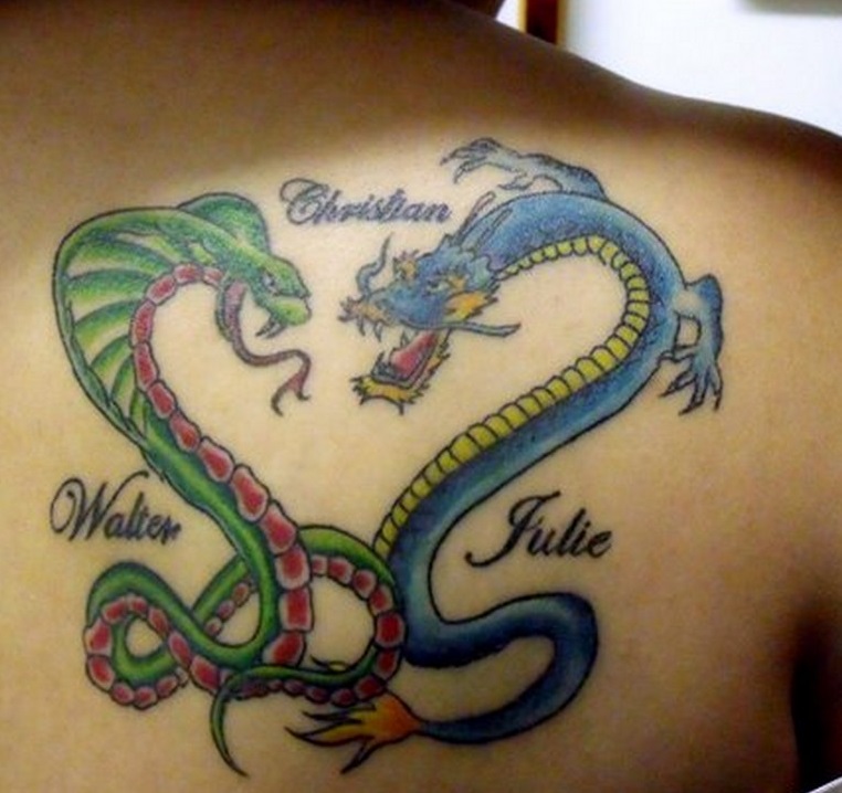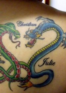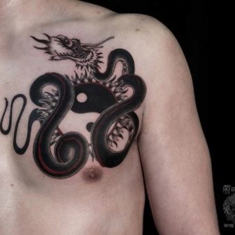 - التنين. يبدو جميلًا جدًا وشمًا به ثعبان وتنين يقعان بجوار بعضهما البعض. هذه الصورة ترمز إلى التوازن.