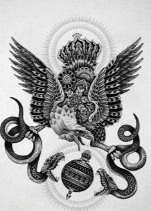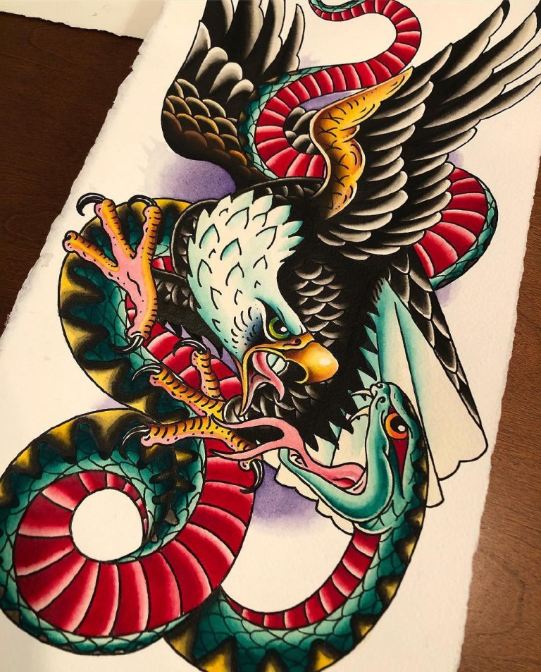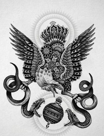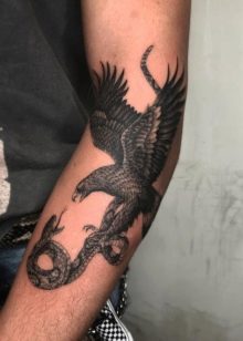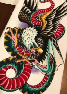 - نسر. كقاعدة عامة ، يصور الأسياد معارضة هذين الممثلين لعالم النباتات. هذا الوشم رمزي جدا. النسر في هذه الحالة يجسد النبلاء ، والثعبان - العاطفة. في الواقع ، يشير هذا الوشم إلى الرغبة في السيطرة على عواطفك.