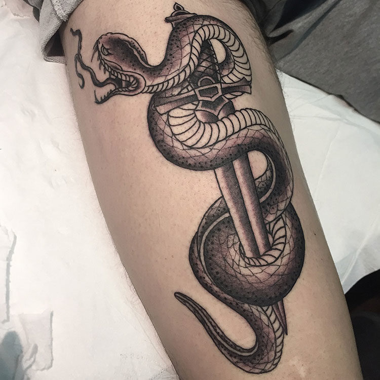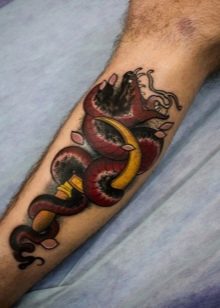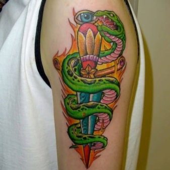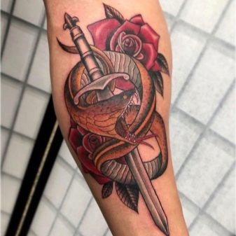 - سيف. ثعبان ملفوف حول وشم سيف بمثابة تذكير بأن الحياة صراع أبدي. مثل هذا الرسم سوف يروق لشخص لا يخاف من المشاكل ويعرف كيف يقابلها وجهاً لوجه. بدلاً من السيف ، قد يكون هناك أيضًا نصل أو حتى مسدس.