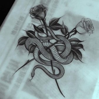 - الوردة. لطالما كانت هذه الزهرة رمزًا للجمال والعاطفة. صورة الأفعى تعزز فقط هذا المعنى. يفضل الرجال ، كقاعدة عامة ، ملء رسومات ثلاثية الأبعاد على أجسادهم بأفاعي مكشوفة وتظهر قوتها ، تتجول حول الزهور. مثل هذا الوشم هو رمز لحقيقة أن الشخص يفوز بسهولة بقلوب النساء. إذا أصيب الثعبان في الصورة بأشواك الورد ، فقد يكون هذا رمزًا لخيانة الشخص من قبل شخص ما. يمكن ملء هذا الوشم في ذكرى الحب المفقود.