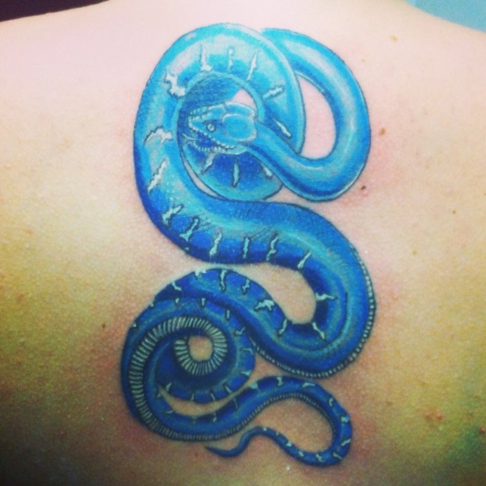 - أزرق. الرسم باللون الأزرق يثير ارتباطات ممتعة. الثعبان الأزرق يرمز إلى الحكمة والحصافة البشرية. عادة ما يتم حشوها على الجسم من قبل الأشخاص الذين يسعون جاهدين ليكونوا دائمًا في وئام مع أنفسهم.