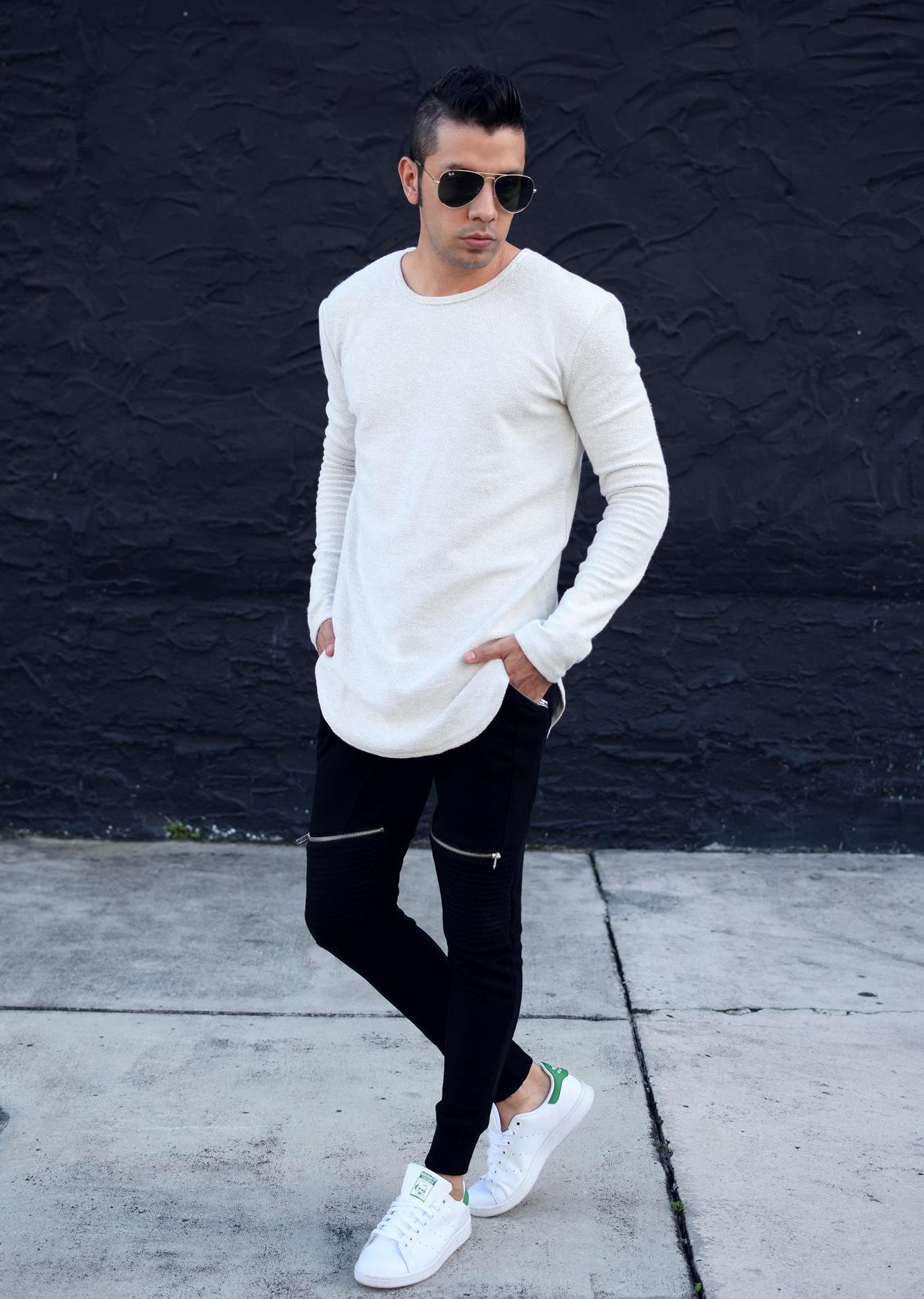 - قميص من النوع الثقيل الأبيض مع سبور سوداء وأحذية رياضية بيضاء - كل ما تحتاجه للحصول على مظهر حضري جميل ؛