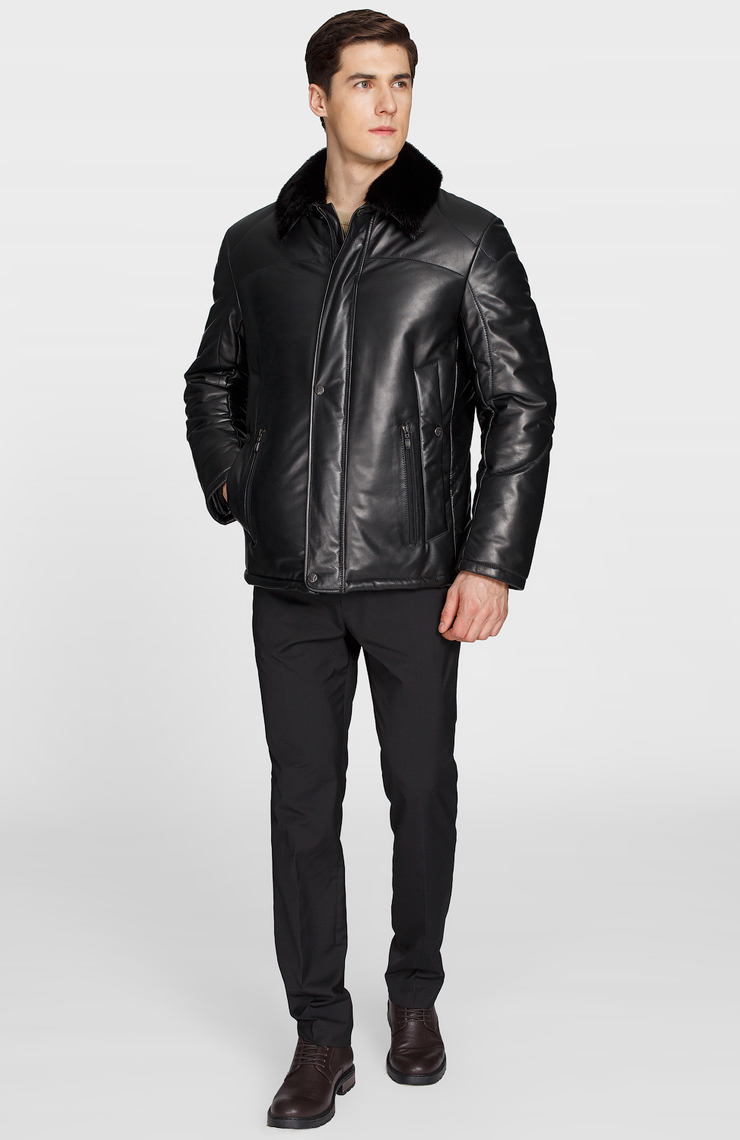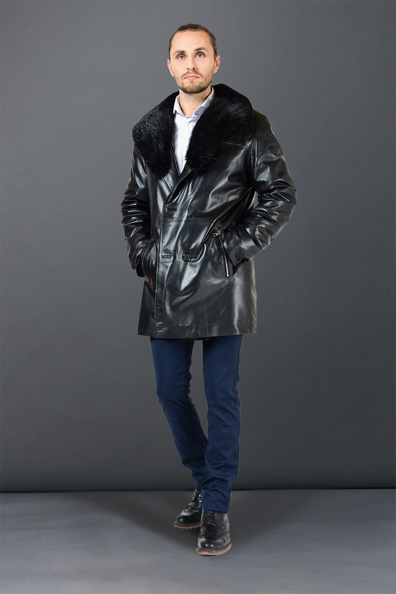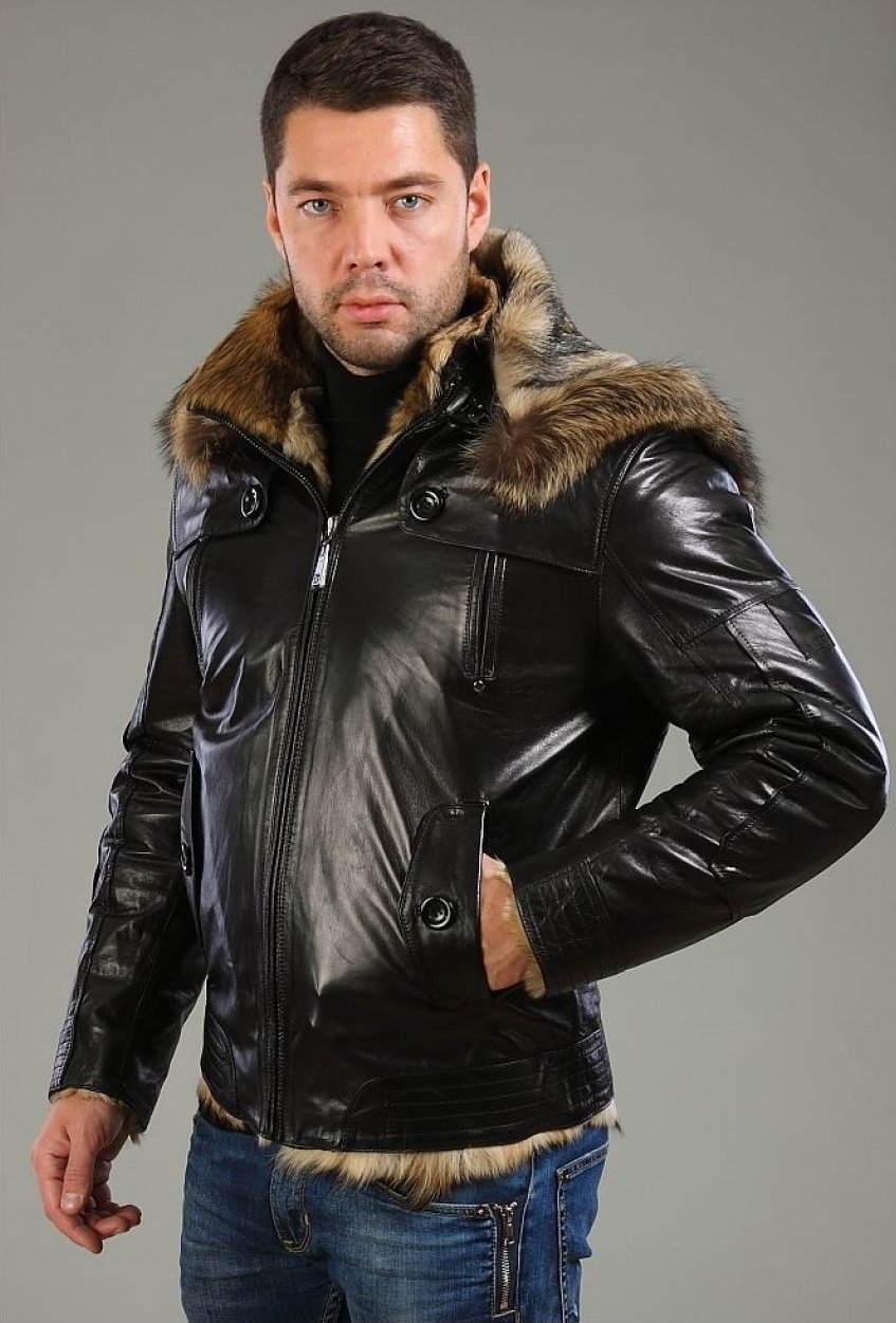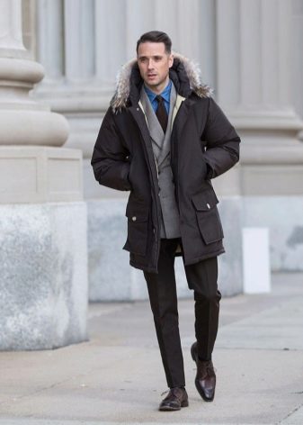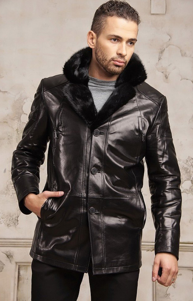 سترة سوداء مع تقليم من الفرو مناسب للرجال الذين يحبون المظهر الأنيق. تبدو جيدة عند إقرانها مع الجينز الكلاسيكي. هناك أنماط مع تصحيحات تجعل الأنماط أكثر تشويقًا.