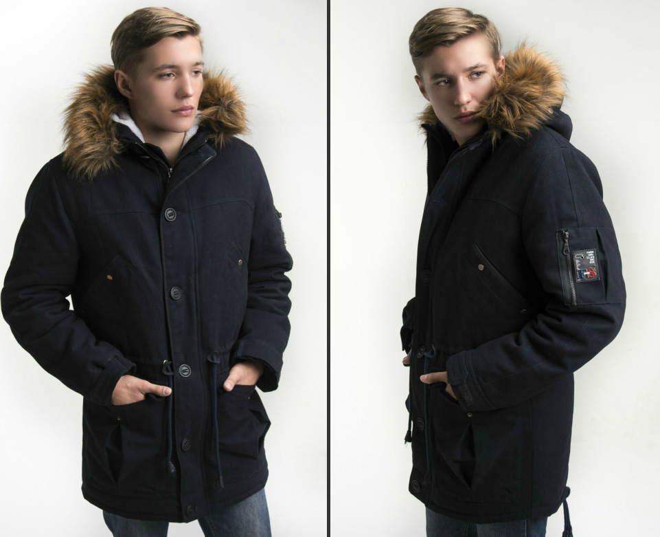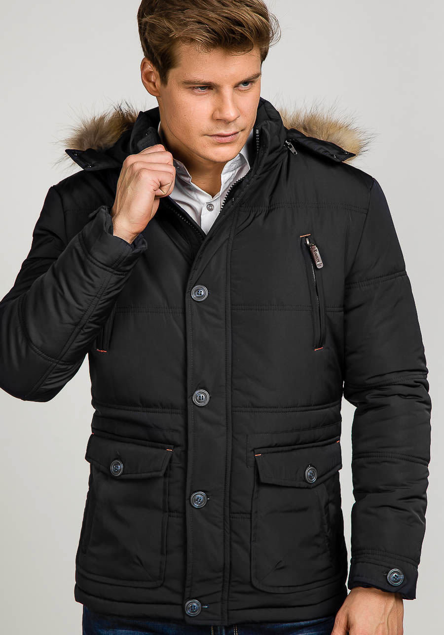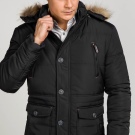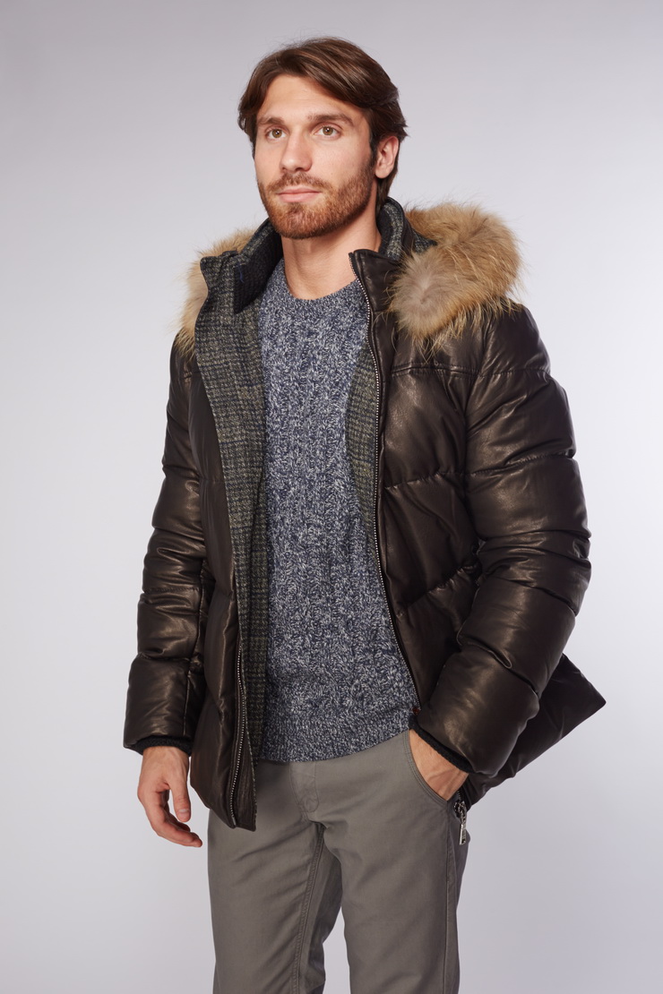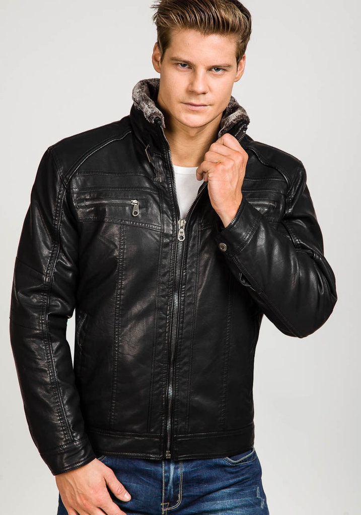 سترة سوداء مع تقليم من الفرو مناسب للرجال الذين يحبون المظهر الأنيق. تبدو جيدة عند إقرانها مع الجينز الكلاسيكي. هناك أنماط مع تصحيحات تجعل الأنماط أكثر تشويقًا.