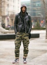 - Такива панталони изглеждат брутално в комбинация с тъмно зелена тениска, черна парка и кецове.