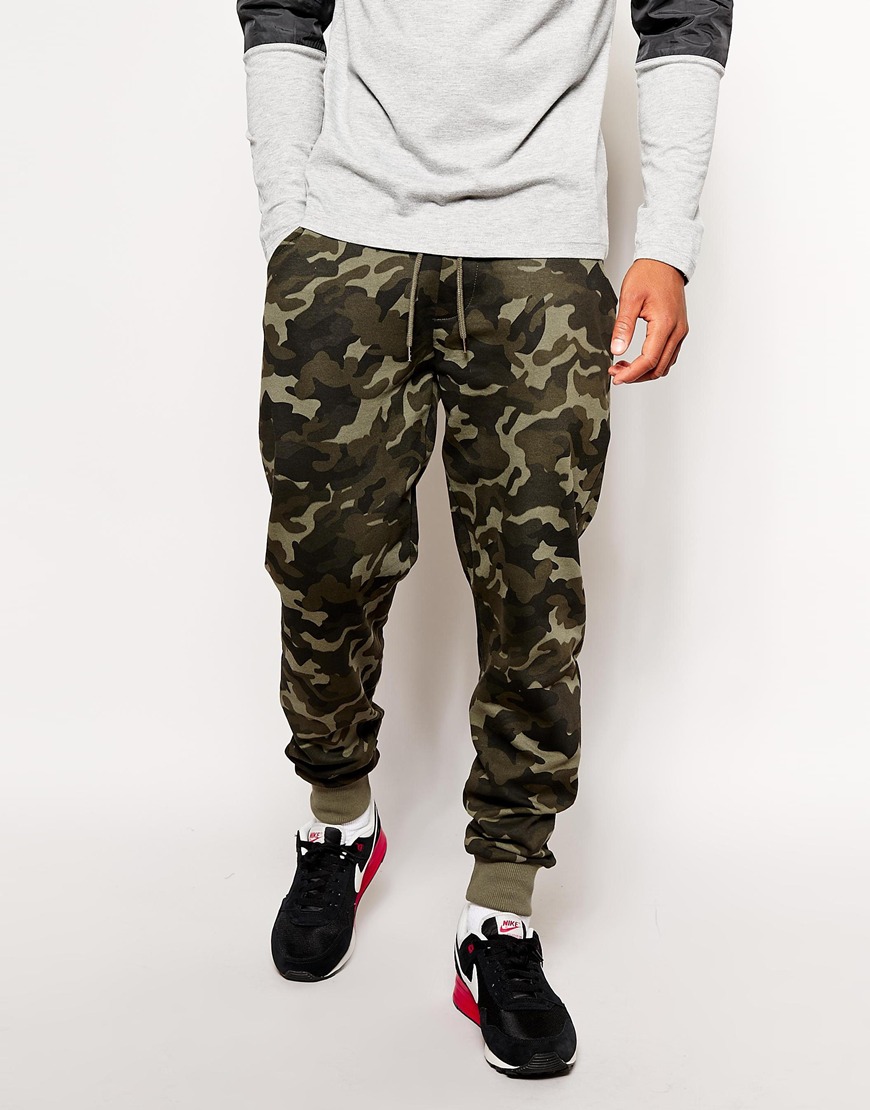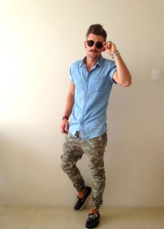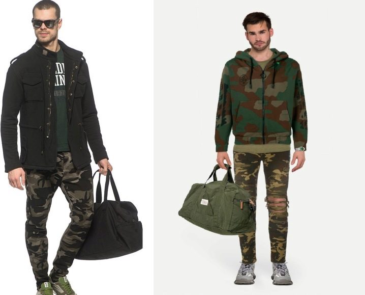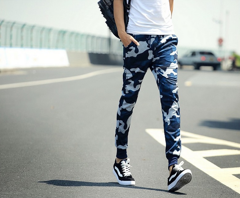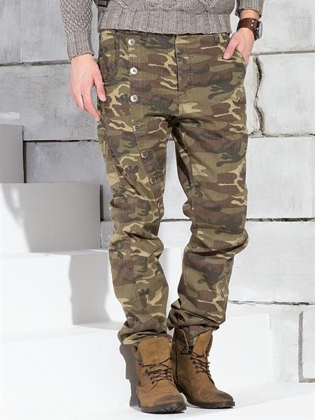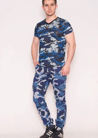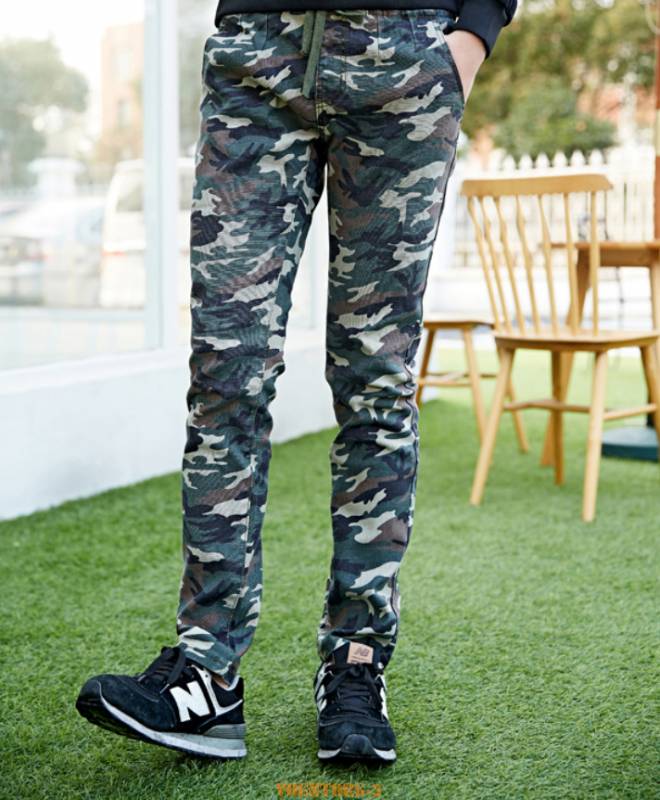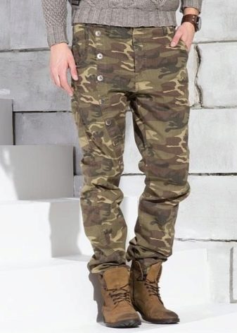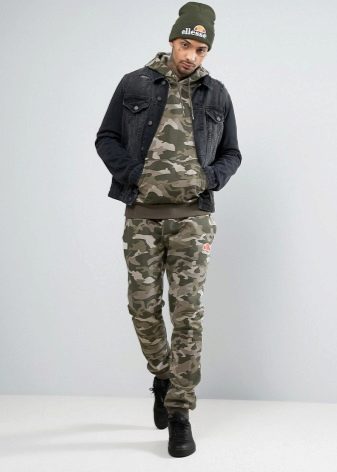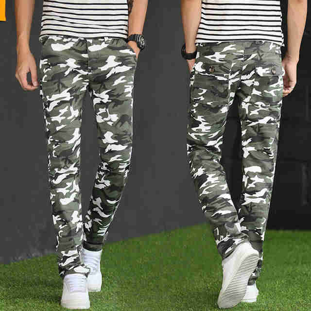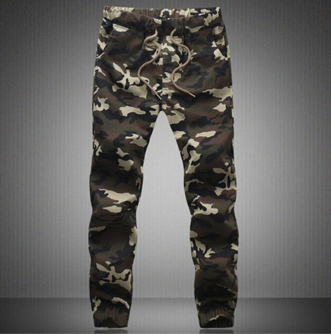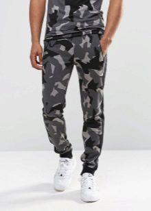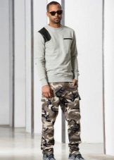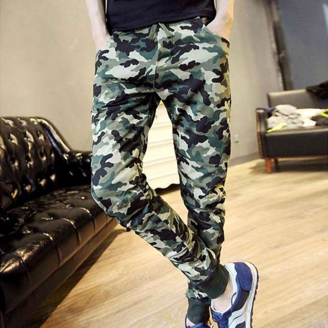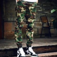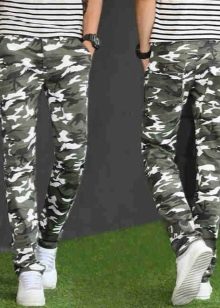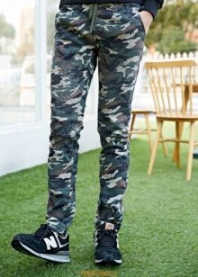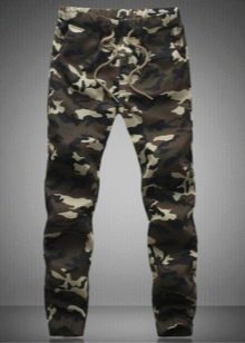 Камуфлажният печат е идеален за спортен стил, не е изненадващо, че дизайнерите редовно пускат дрехи във военния стил. Принципите на такива модели са свобода, комфорт. Панталоните могат да бъдат прави, със или без ластик в долната част, и свободни. Основното нещо е удобството за спортуване.