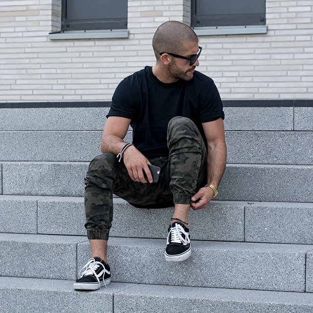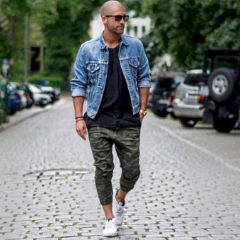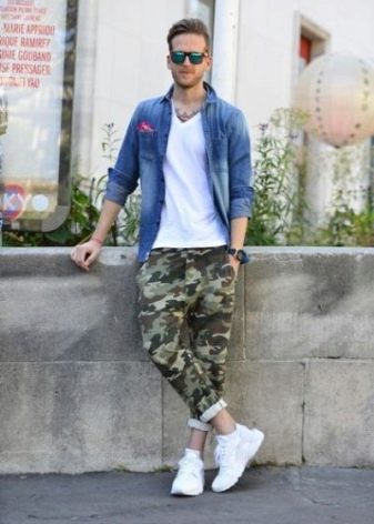- Дънково яке и модерни спортни обувки са чудесно допълнение към военните панталони.
