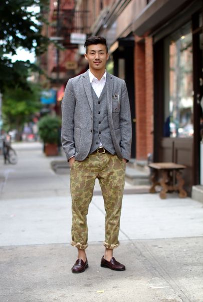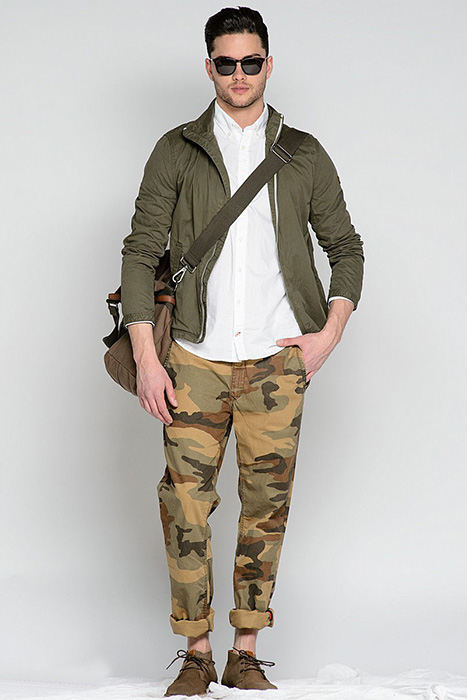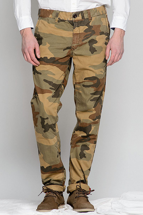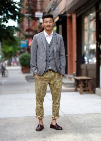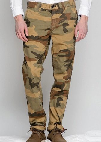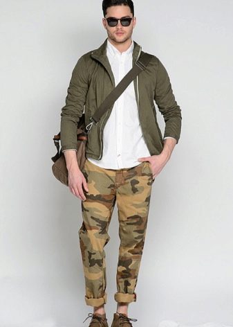 - лек камуфлажен принт се комбинира добре с монохромни ризи и фланелни блейзери, за да пасне на панталона;