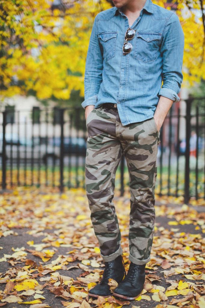 - през есента камуфлажните панталони могат да се носят с кожено яке, ярки пуловери;