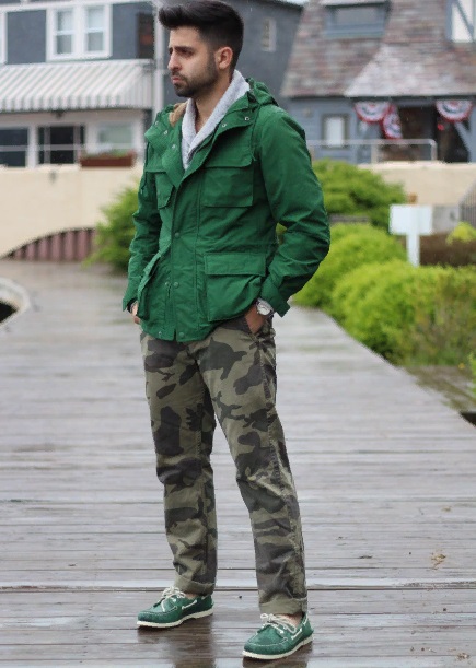 - облеклото от деним изглежда страхотно с камуфлаж, например яке;