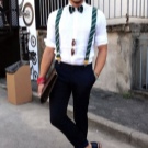 - ризата е прибрана в панталона само от едната страна на предната част;