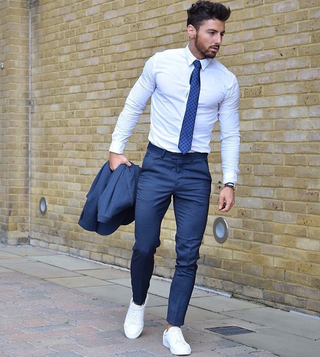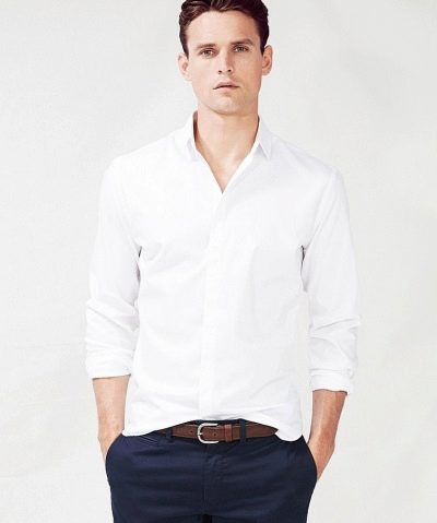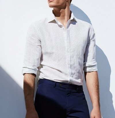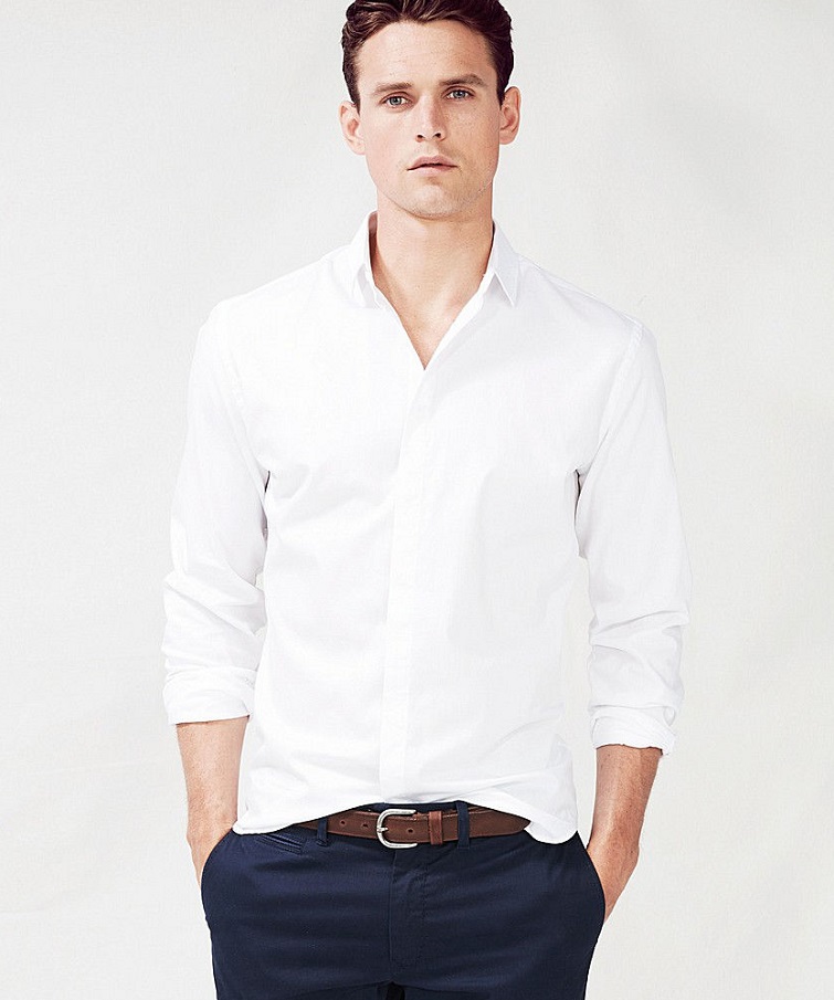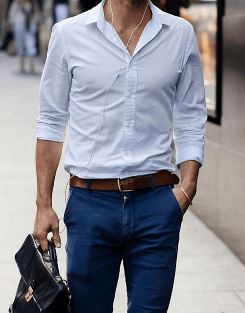 - Бяла риза, прибрана в тъмни панталони, е традиционна комбинация, която може да се направи по -непринудена, като леко запретнете ръкавите.