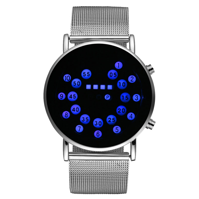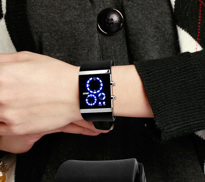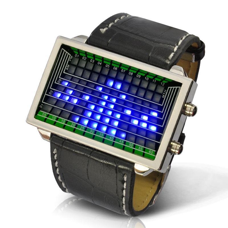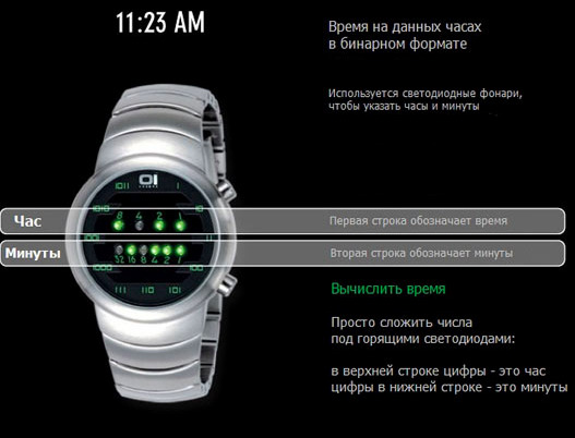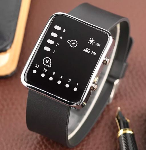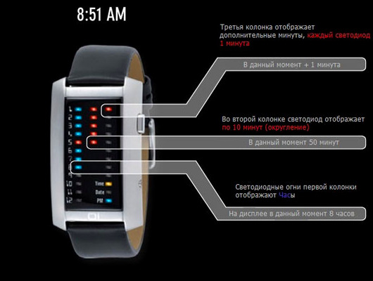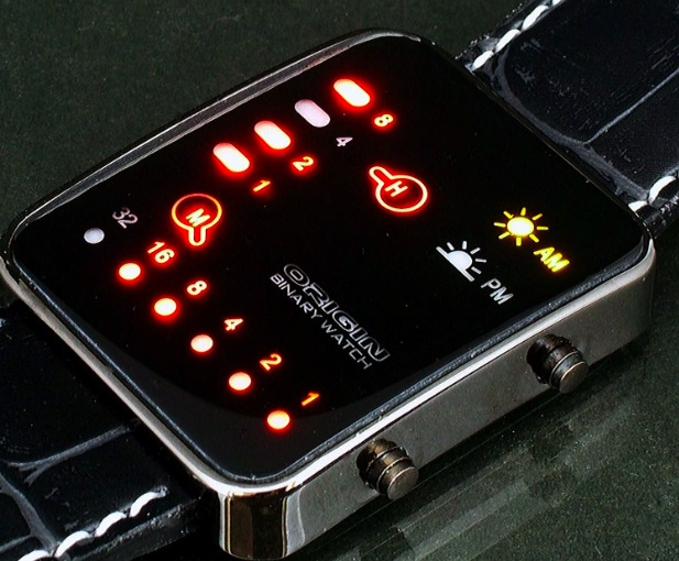 Устройствата с двоична система за отчитане на времето са напълно различни от обикновените часовници, тъй като в тях механизмът няма обичайните индикатори за време. Цялата информация се показва на трептящ LED екран.