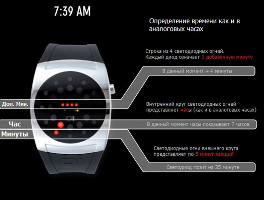 Иновацията на използвания метод е, че на циферблата, номерът е изобразен като сума, която се изчислява от няколко цифри. Одобреният брой светодиоди съответства на минути и часове. Доста е трудно бързо да настроите часа на такъв часовник, тъй като само един поглед няма да бъде достатъчен. Необходимо е да се направят изчисления, поради което това устройство се нарича "умно".