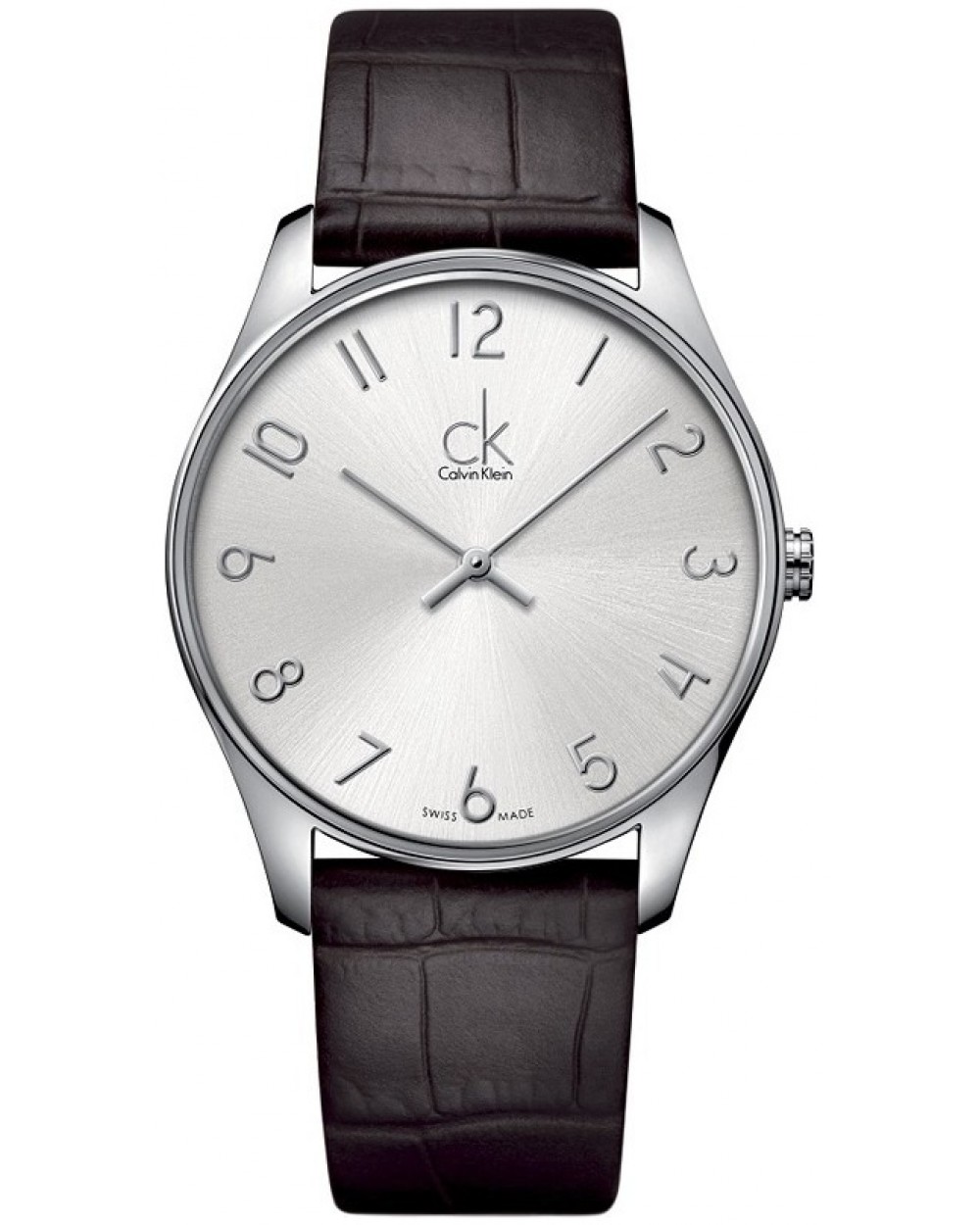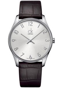 - CK Основан... Лаконичен модел на маркови мъжки часовници, който изглежда строг и представителен. Оборудван с кварцов механизъм, кожена каишка от черен цвят. Подобно на предишните модели, този часовник е водоустойчив (до 3 бара). Ще изглежда страхотно както в ежедневието, така и в бизнес ансамблите.
