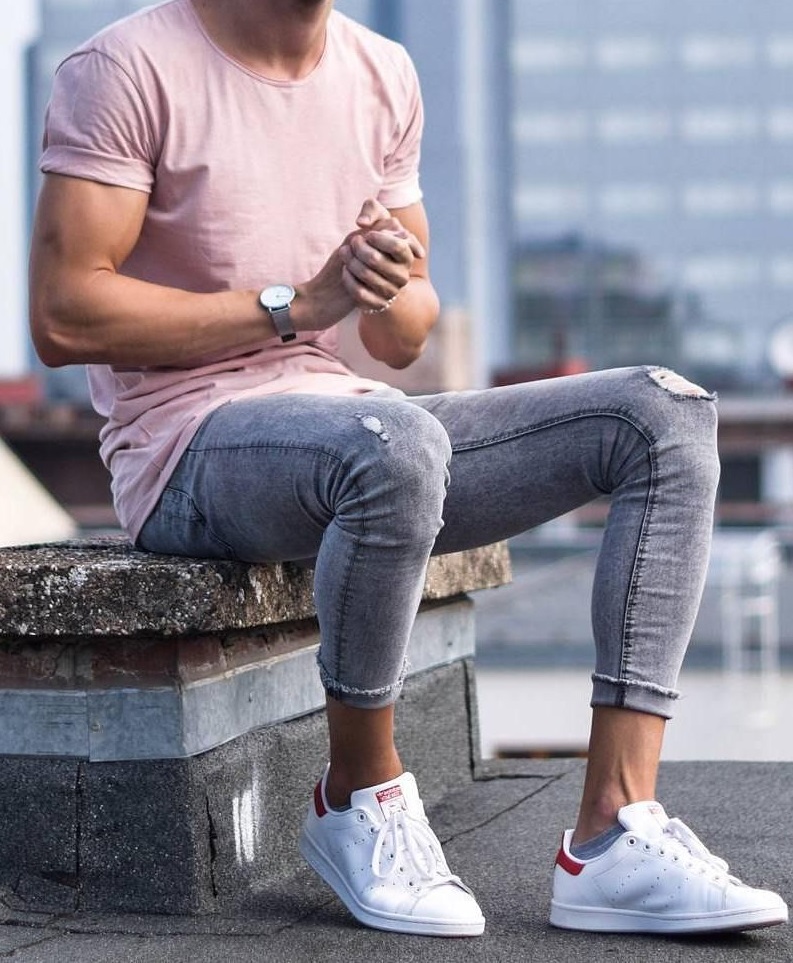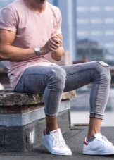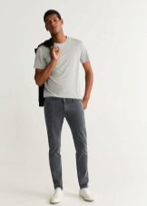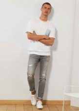 Класическият комплект е сиви дънки и бяла или черна тениска, съчетана с мокасини или маратонки. Ако сте избрали черна тениска и обувки от същия нюанс, тогава изображението може да бъде допълнено с яке или вятър каки.